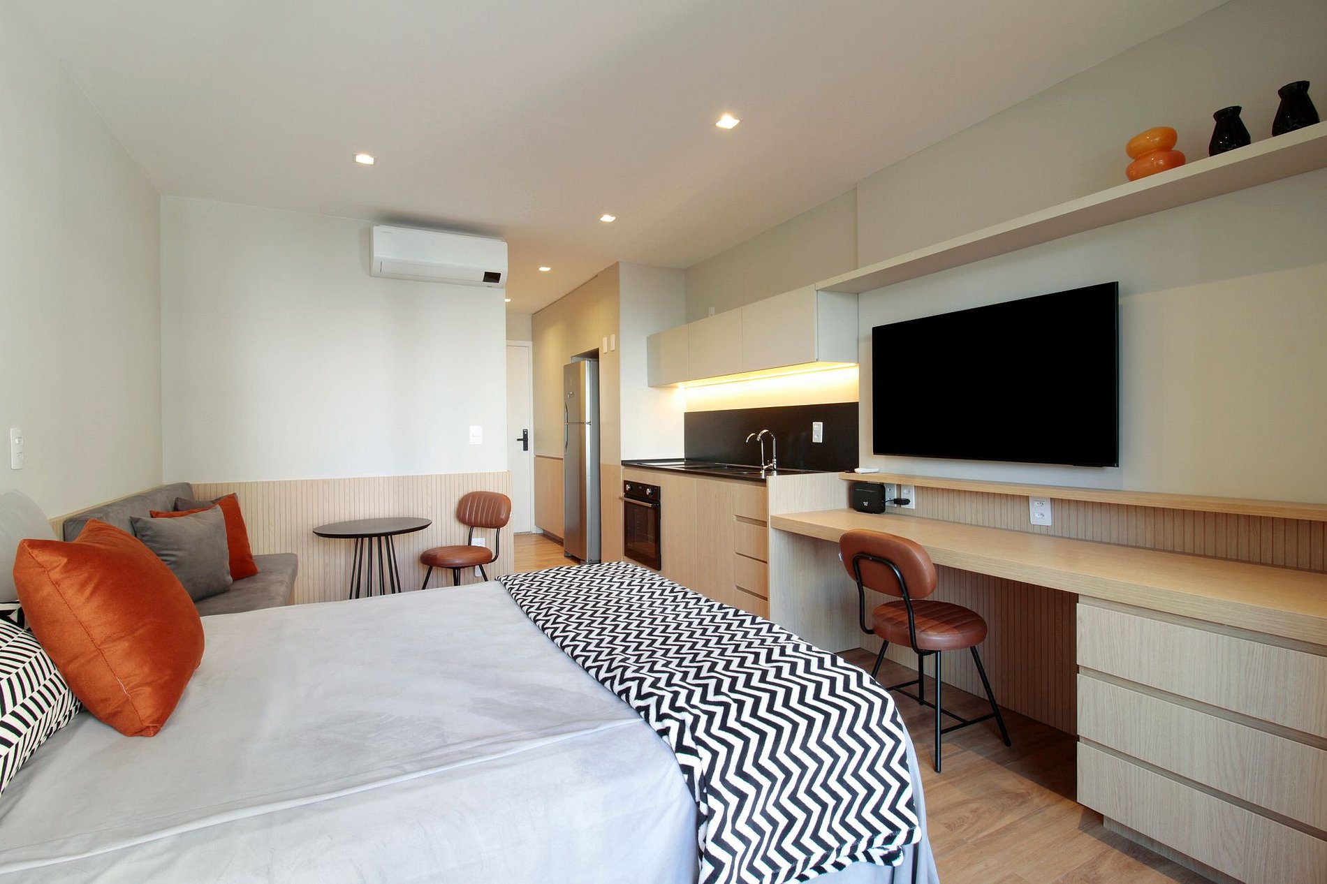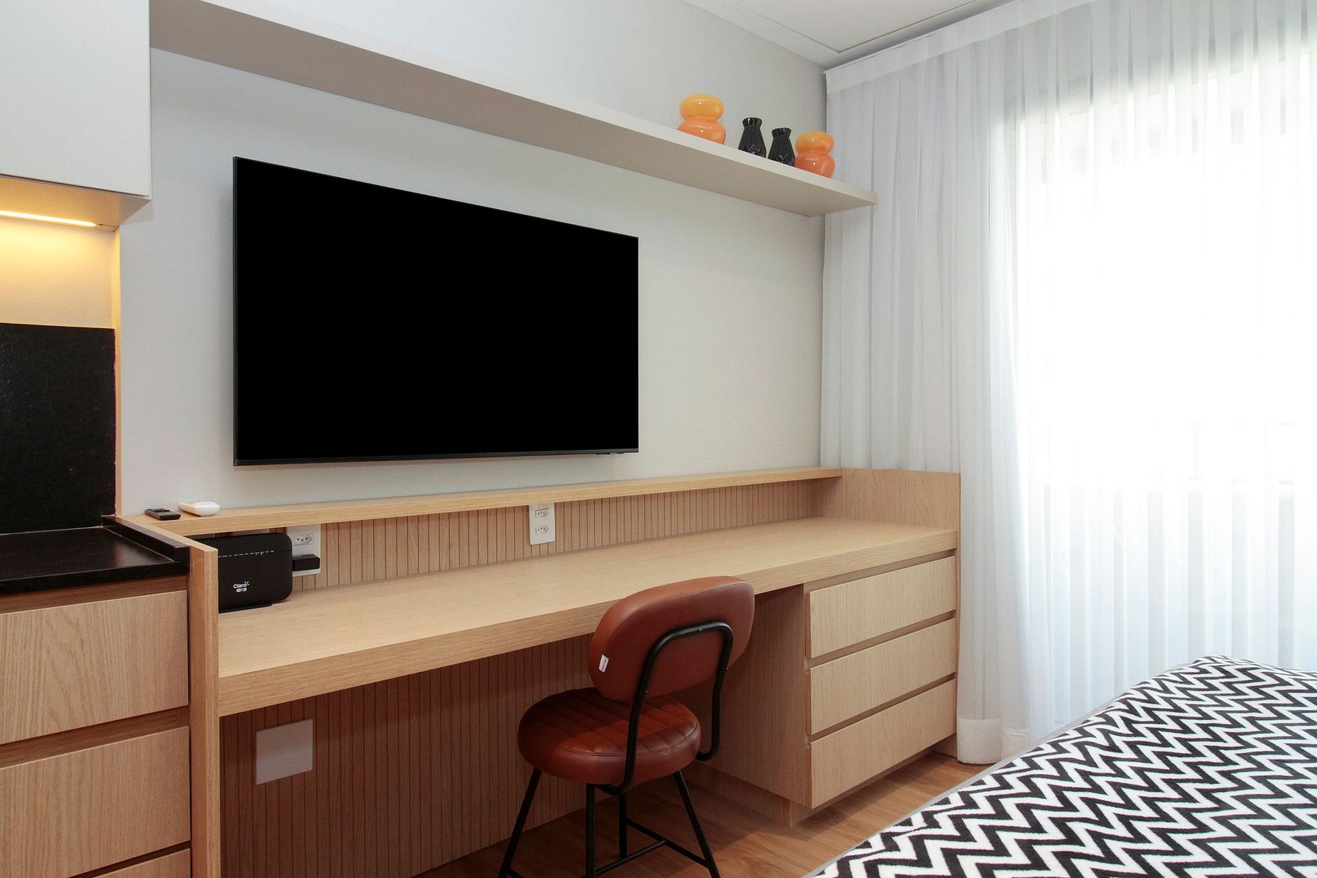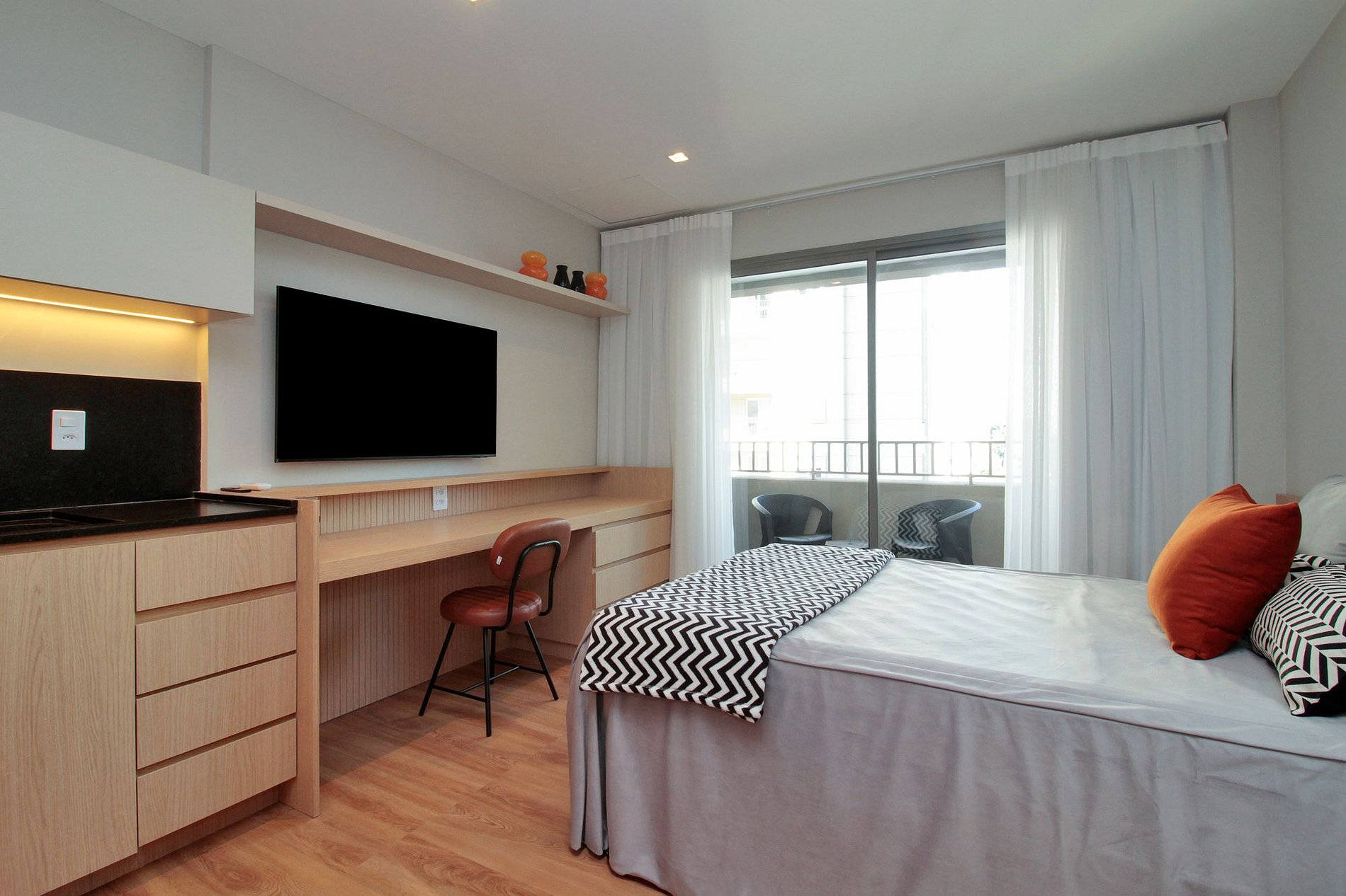 The smart TV is ideally sized for the room, and the terrace offers a special spot to enjoy the city view or relax with a glass of wine.