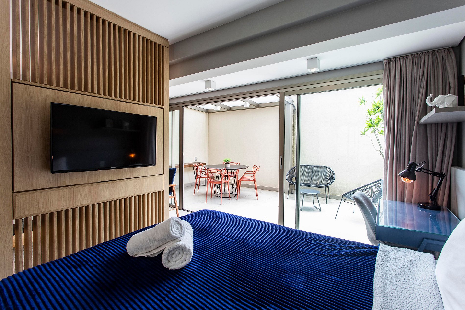 Charming garden apartment featuring both open and covered spaces. Ideally situated in one of São Paulo’s most desirable neighborhoods, between Jardim Paulista and Itaim Bibi. Enjoy an airy backyard, inviting decor, seamless living areas, a fully equipped kitchen, air conditioning, Smart TV with cable, Wi-Fi, a workspace, queen bed, and a modern new bathroom.