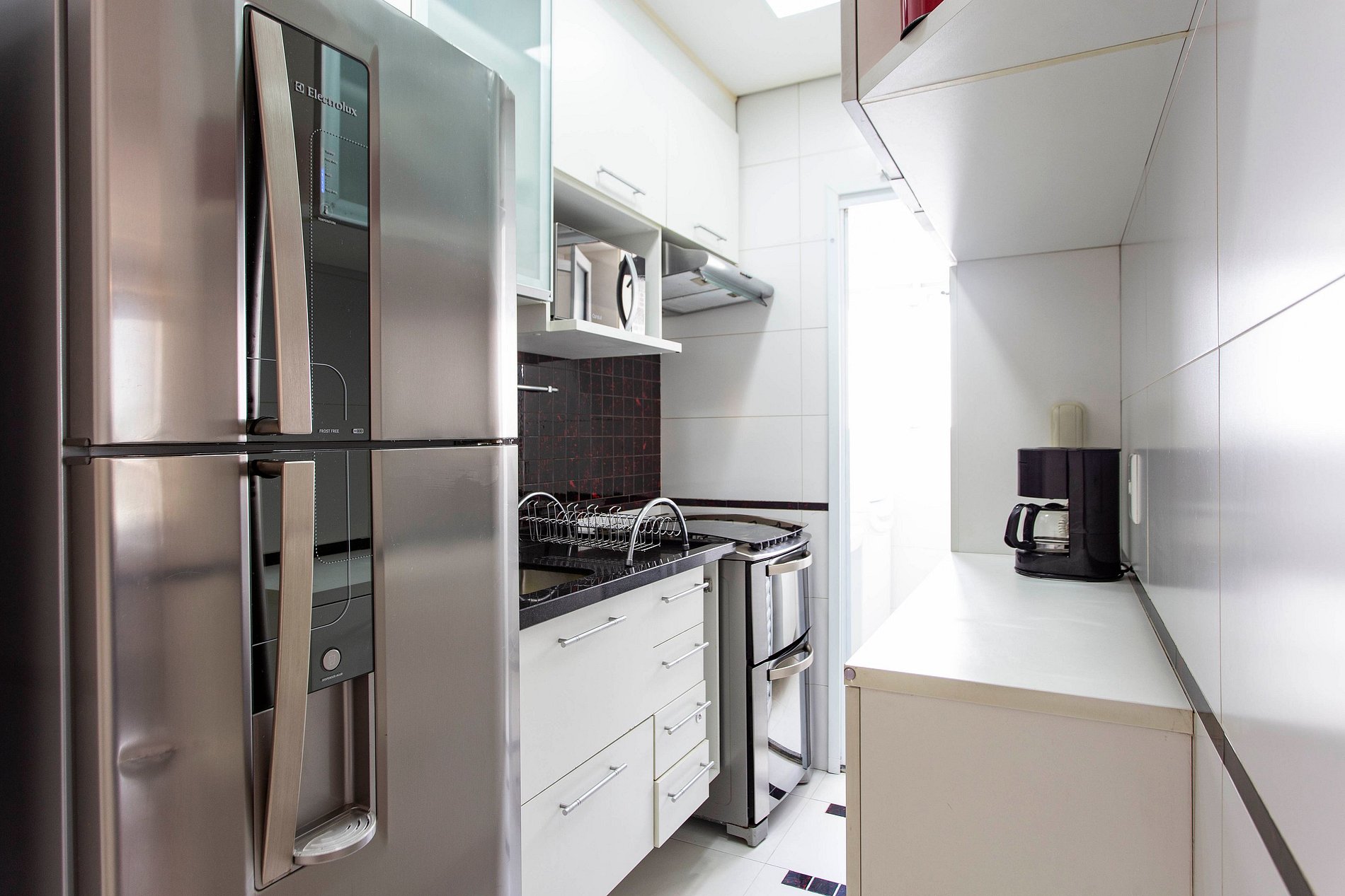 This popular duplex is just 3 minutes from Congonhas Airport. It features one bedroom with a double bed, a suite with a large closet, a fully equipped kitchen, bathroom, living room with a sofa bed, cable TV, enclosed balcony, and laundry room with washer and dryer. Upstairs offers a home office, backyard with barbecue grill, wood oven, sofa, dining table for eight, and a mini kitchen. The building offers a full range of amenities.