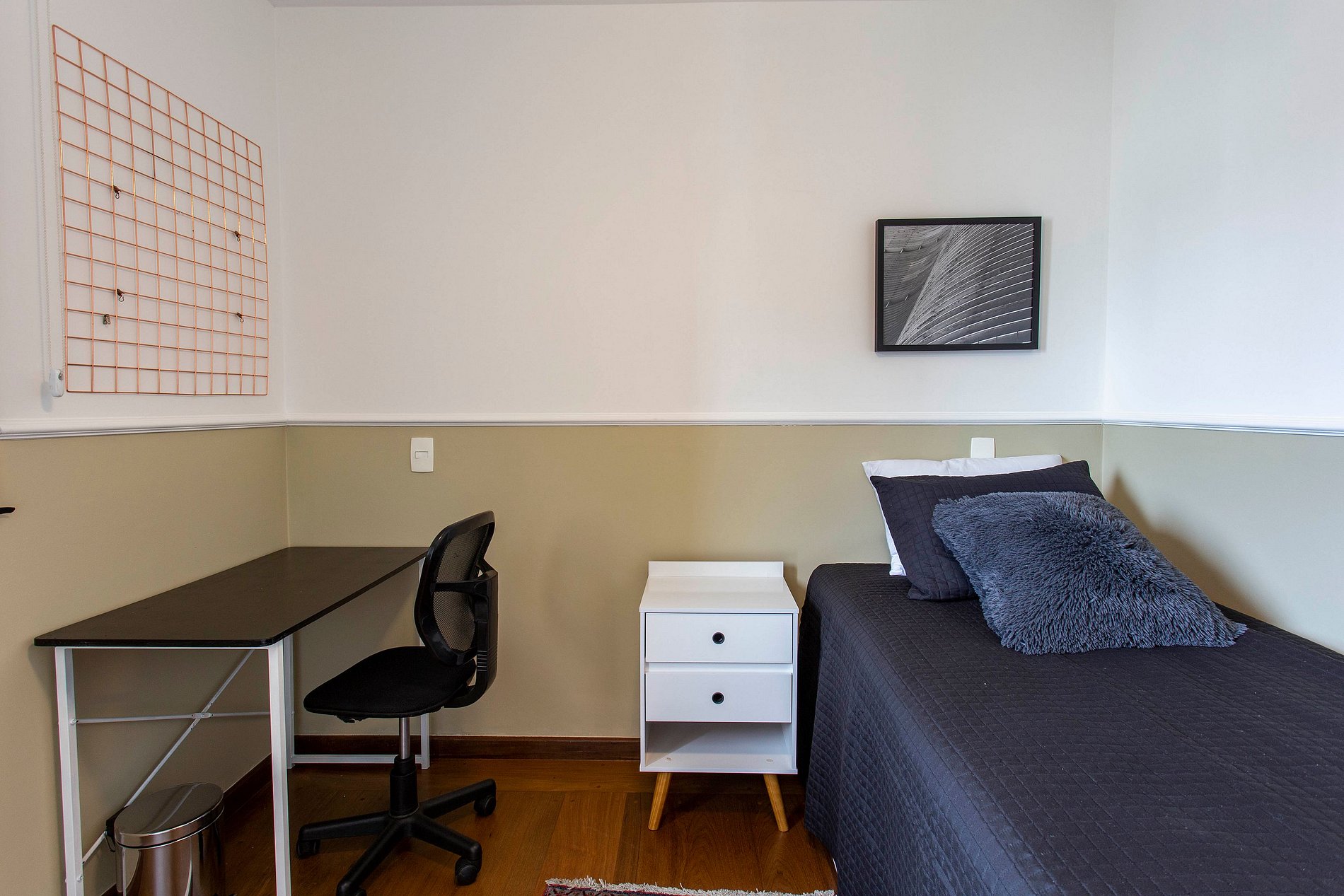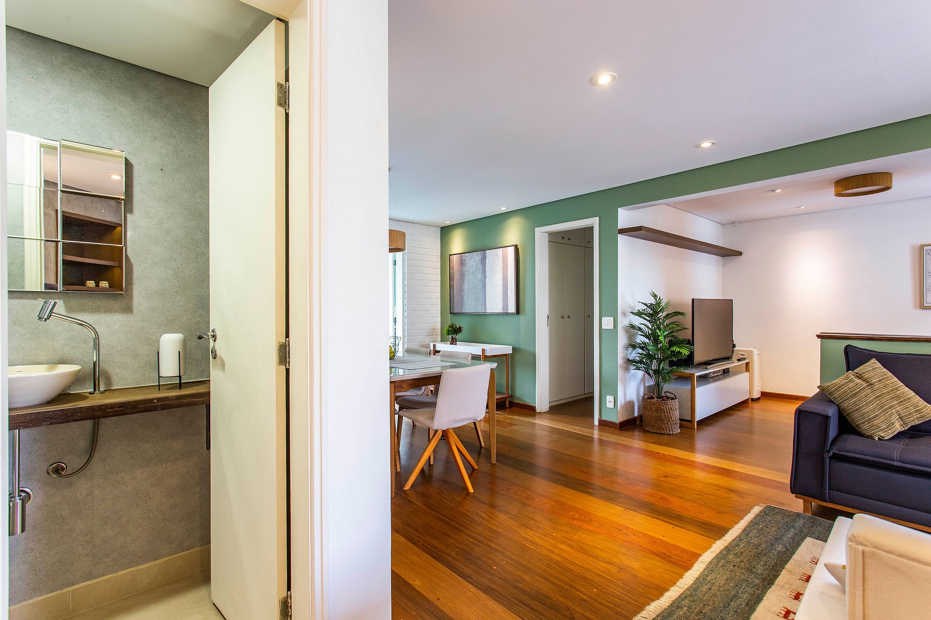 Apartment designed to make you feel at home. Dining room integrated with the TV room, balcony, equipped kitchen, Wi-Fi and service area with washing machine and care in every detail. Located in a privileged neighborhood, with supermarket, pharmacy, restaurant and local commerce.