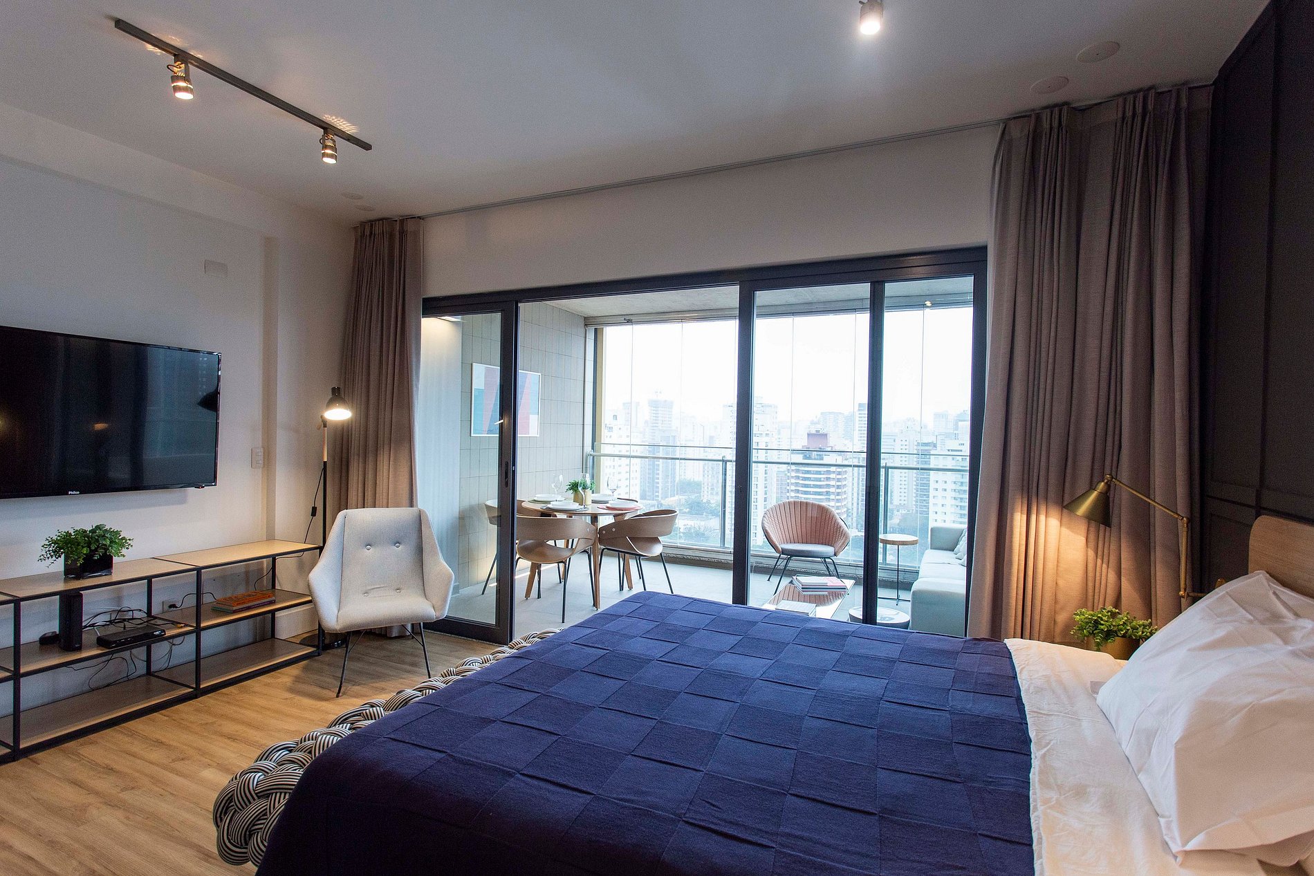 Studio featuring a queen bed with provided sheets and towels for your stay, air conditioning, Smart TV, wardrobe, and a full bathroom. The kitchen is compact yet fully equipped with a variety of utensils for your convenience. There is also a second space, the balcony—our favorite area—featuring a sofa, dining table, and a stunning city view from the 17th floor.