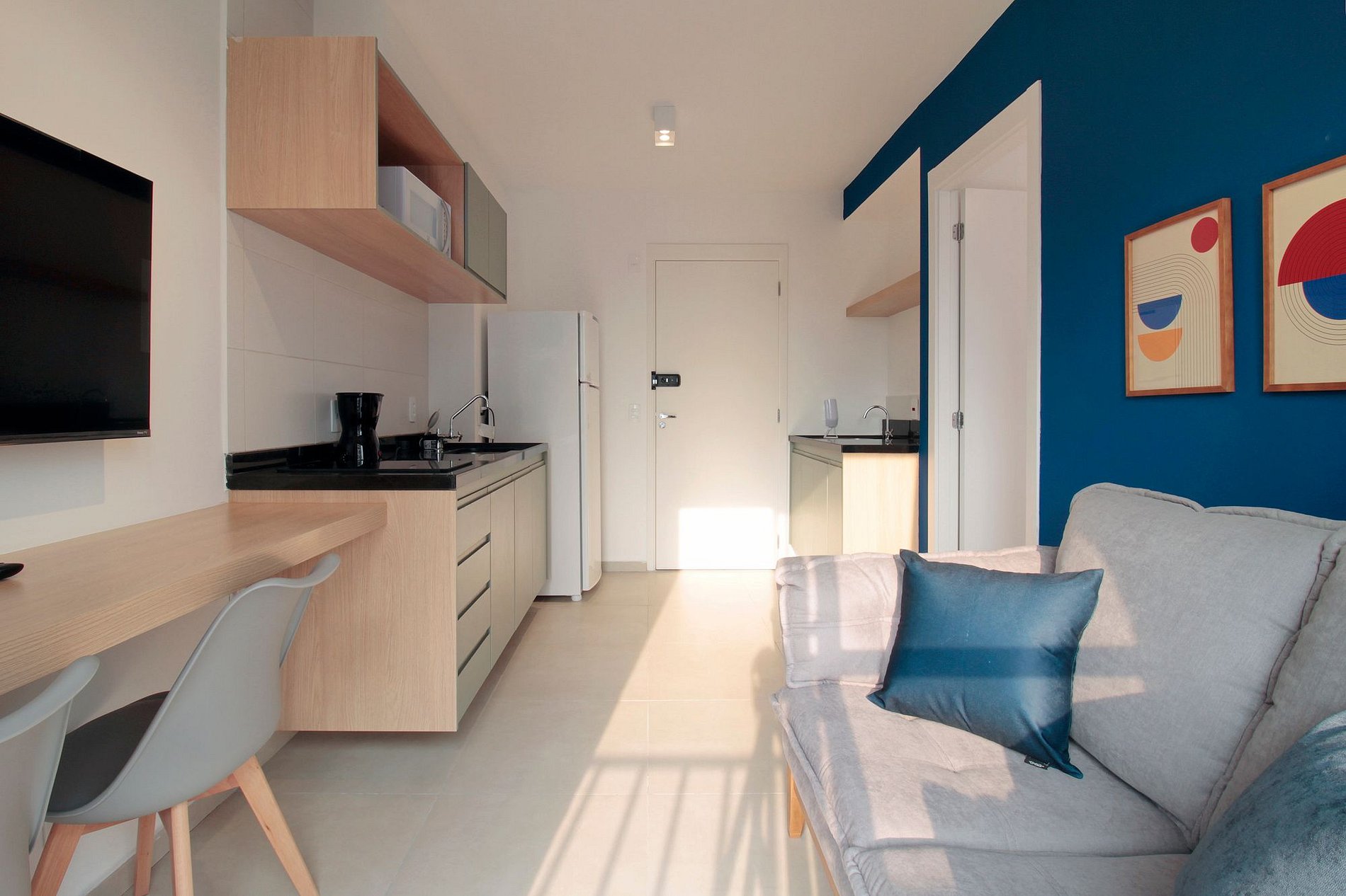 The room has air conditioning, blackout and excellent linen. The living room, integrated with the kitchen, also offers comfort with Smart TV, full kitchen, space for meals and home office and a small balcony with a beautiful view.