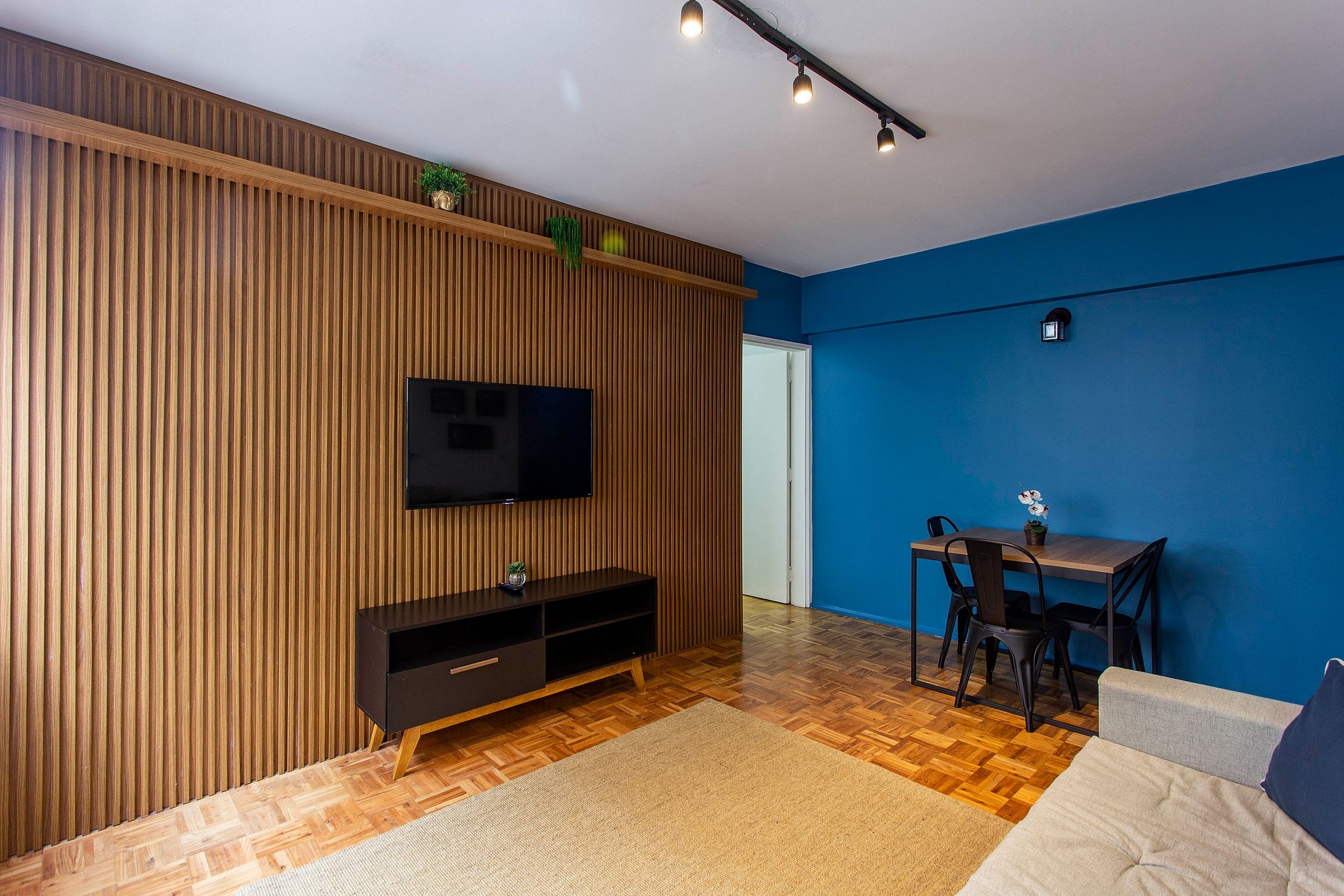 Charming and equipped, this apartment is located in a privileged area in Jardins. It has two bedrooms, both with window air conditioning and blackout: one of them has a double bed and the other has a single bed and a single bunk bed. Cozy living room integrated with the kitchen, equipped kitchen, smart TV, Wi-Fi and protective nets on the windows. The service area has a washer and dryer.