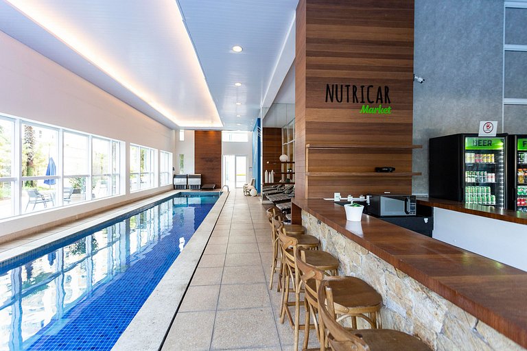 Ideal for vacation stays, business stays, or long-term rentals. The building's common area includes an indoor and outdoor pool with sun loungers and exclusive bar, full gym, outdoor playground, game room, and a convenience area.
