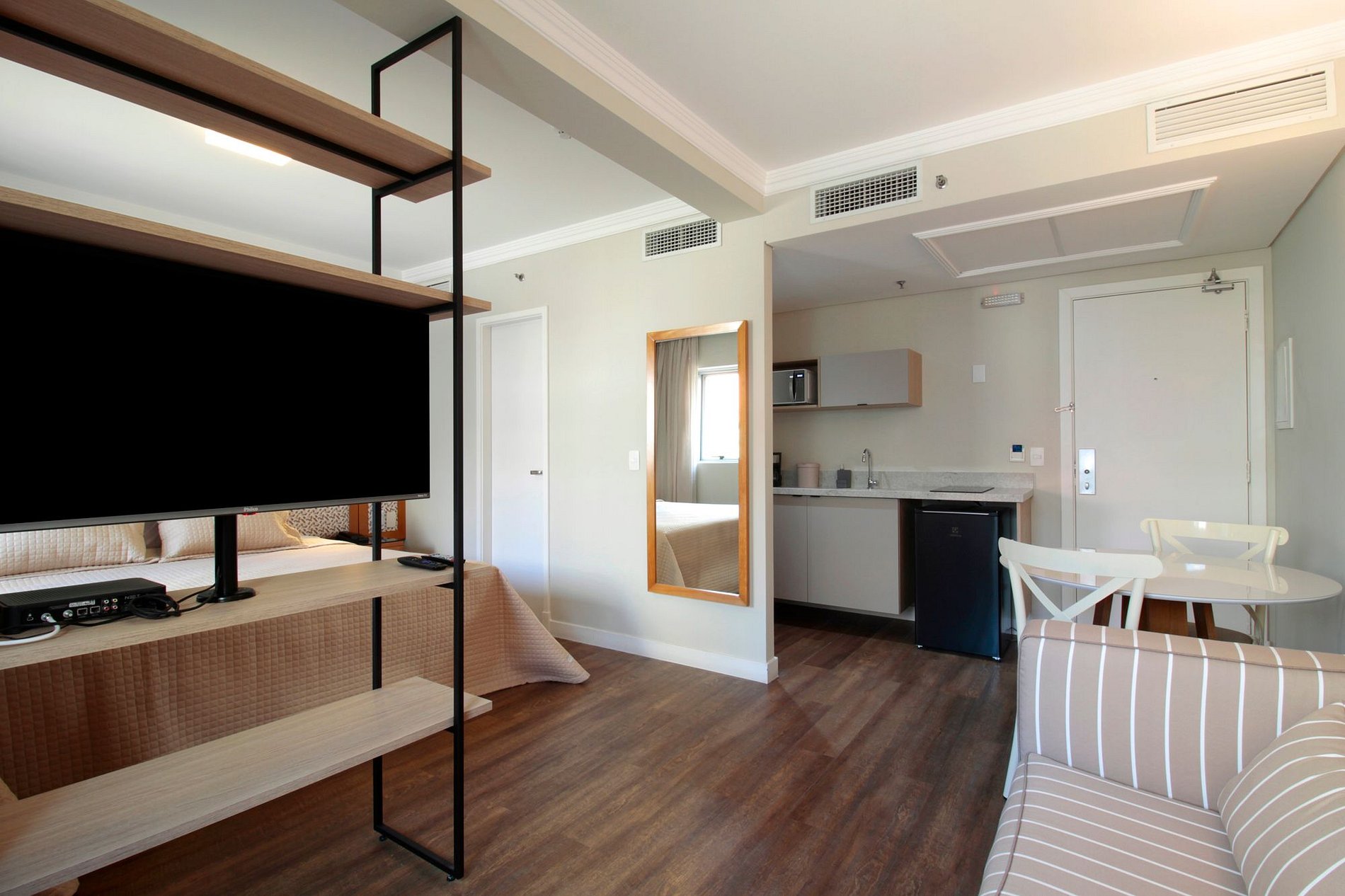 Enjoy blackout curtains, high-speed internet, a rotating Smart TV, air conditioning, quality linens, and a fully equipped compact kitchen, ensuring a comfortable and memorable experience. :)