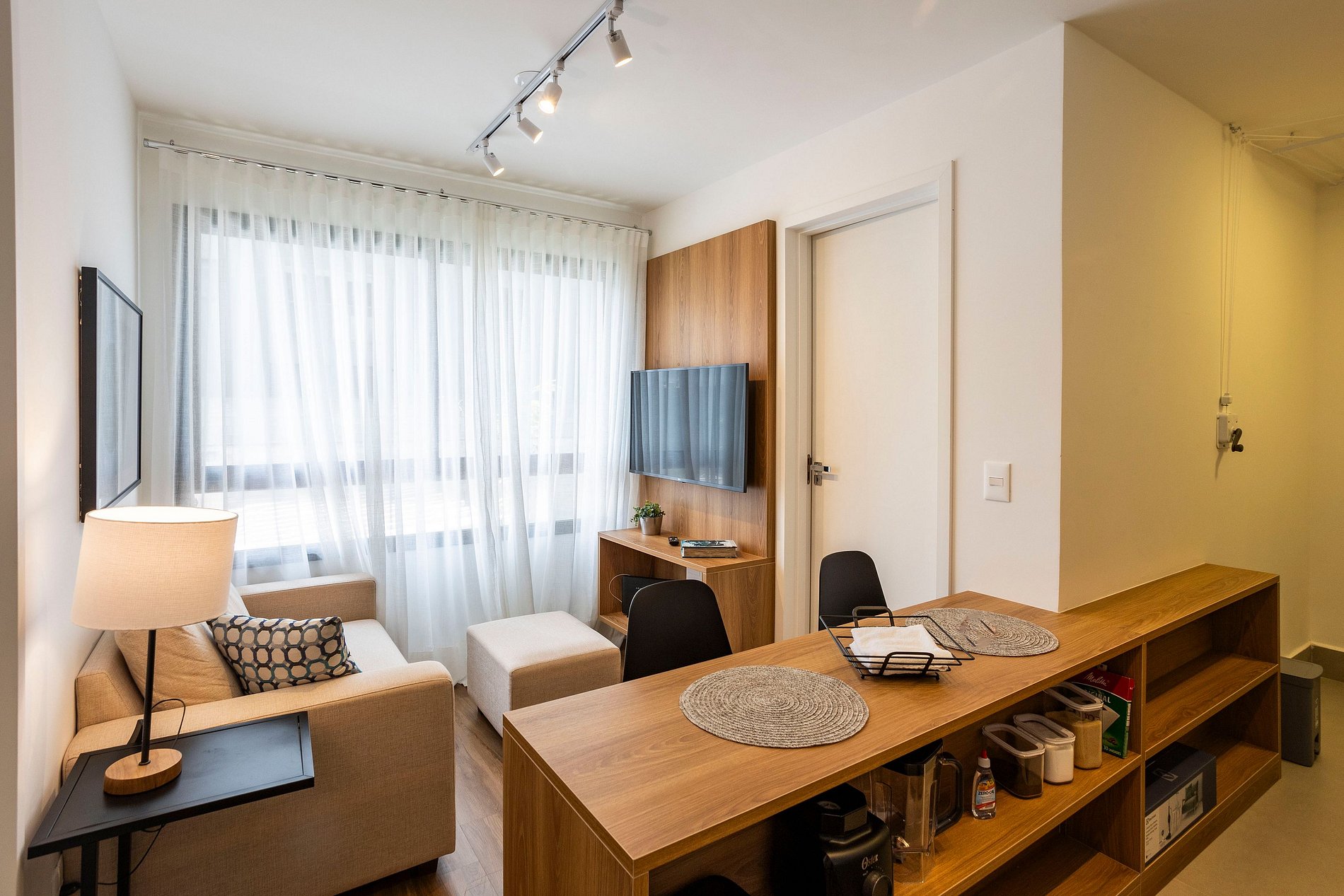 La sala de estar cuenta con Smart TV, internet de alta velocidad, un amplio ventanal y está integrada con la cocina bien equipada y el área de lavandería.