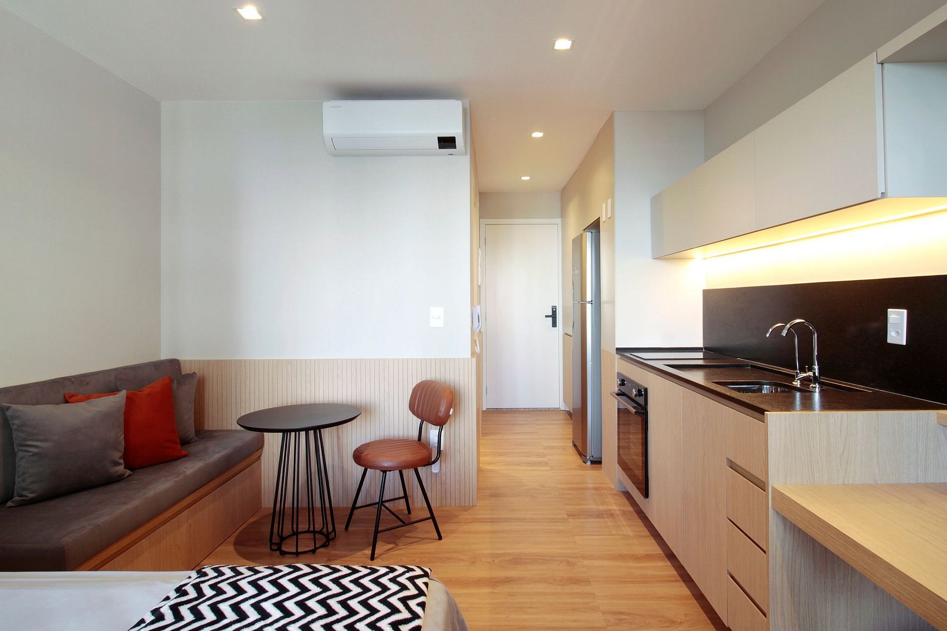El estudio fue diseñado para adaptarse a todo tipo de hospedaje. Por eso, la cocina está completamente equipada, incluido el horno, y los juegos de ropa cuentan con una calidad superior, brindando gran comodidad.