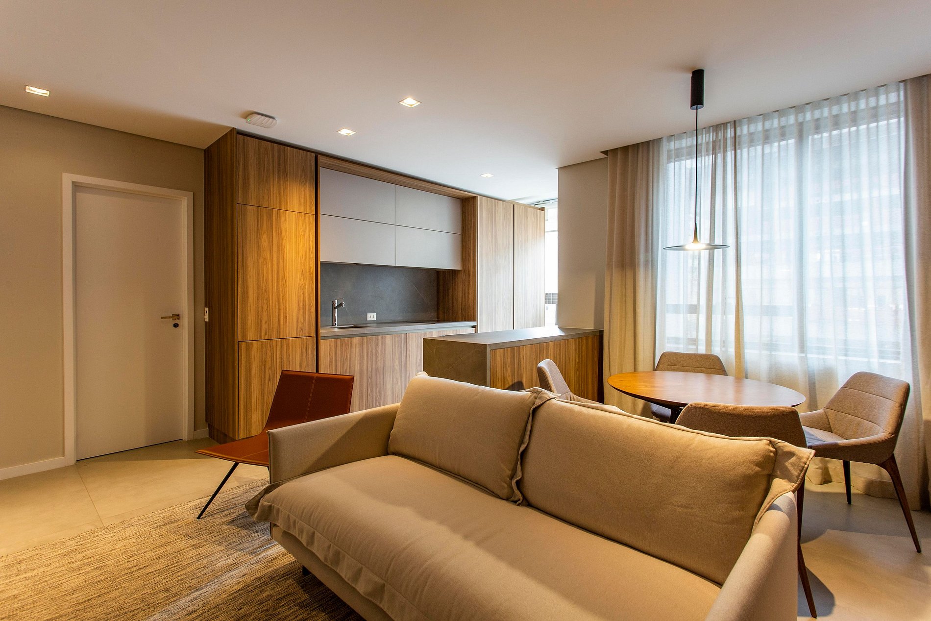 Apartamento con dos suites con aire acondicionado, cocina equipada, mesa de comedor, Smart TV, canales de cable, ropa de cama y toallas, cortinas opacas y una excelente ducha. Las habitaciones se conectan con la sala de estar, generando un ambiente luminoso y acogedor. Incluye limpieza diaria básica y un desayuno delicioso para su comodidad.