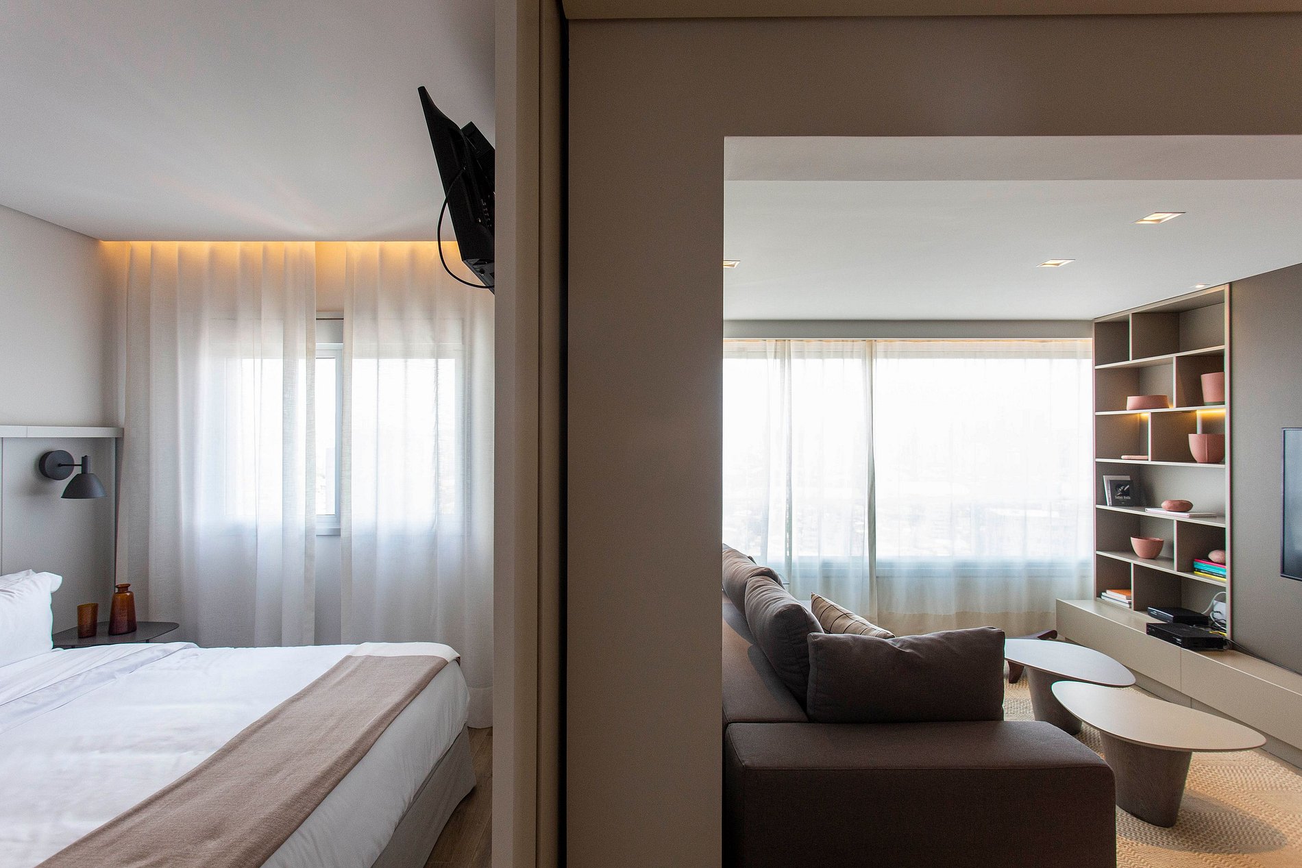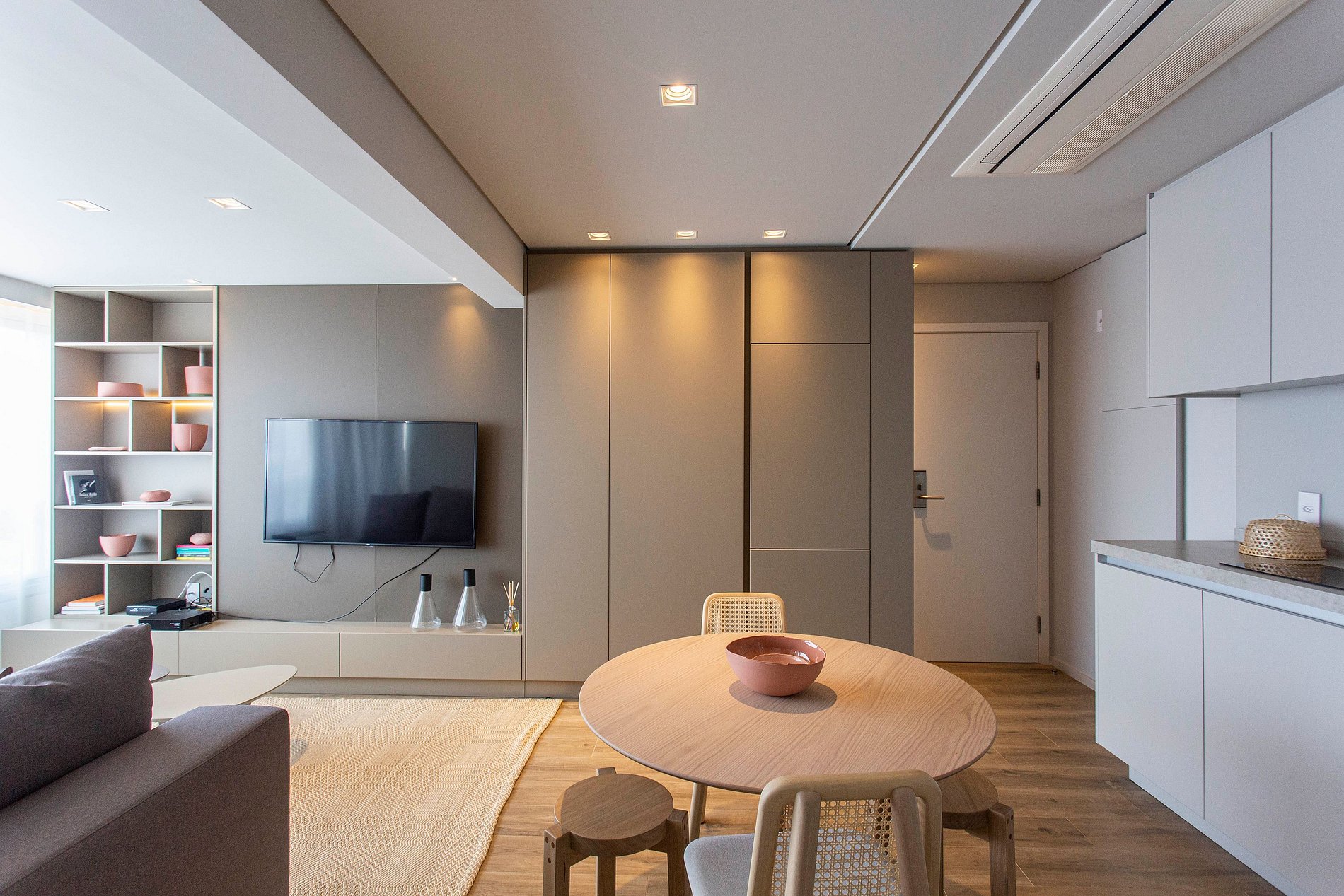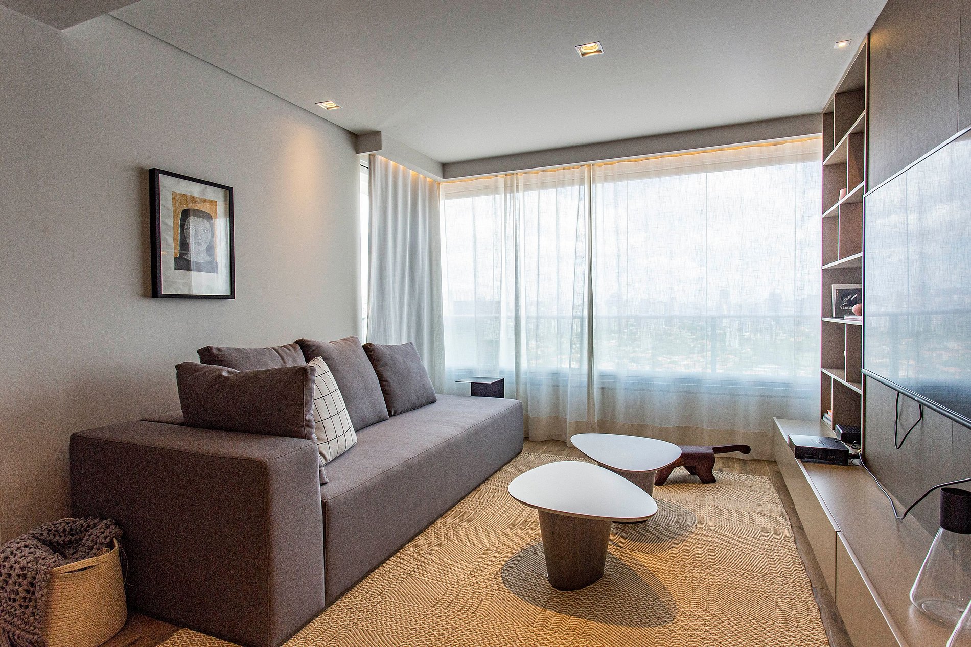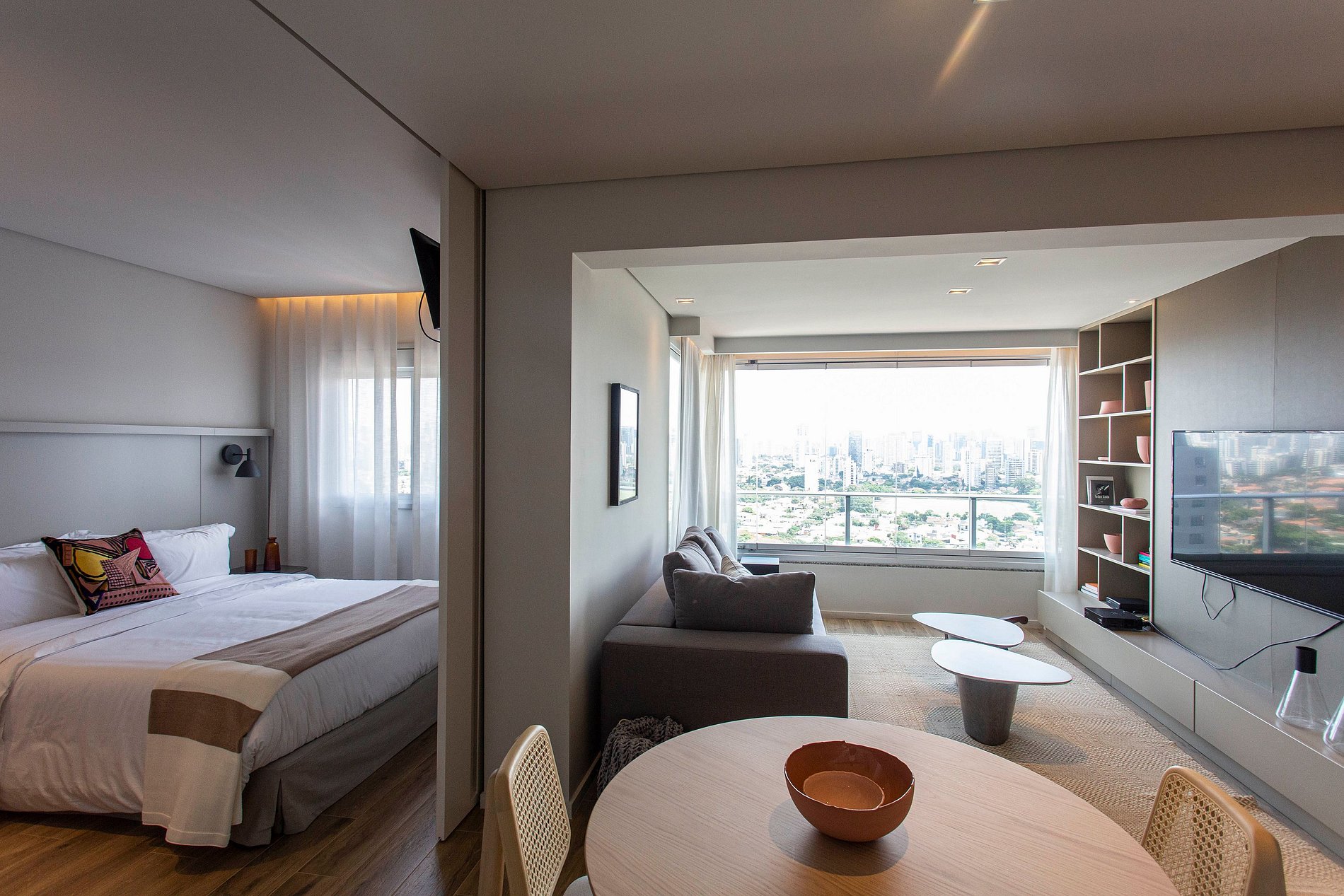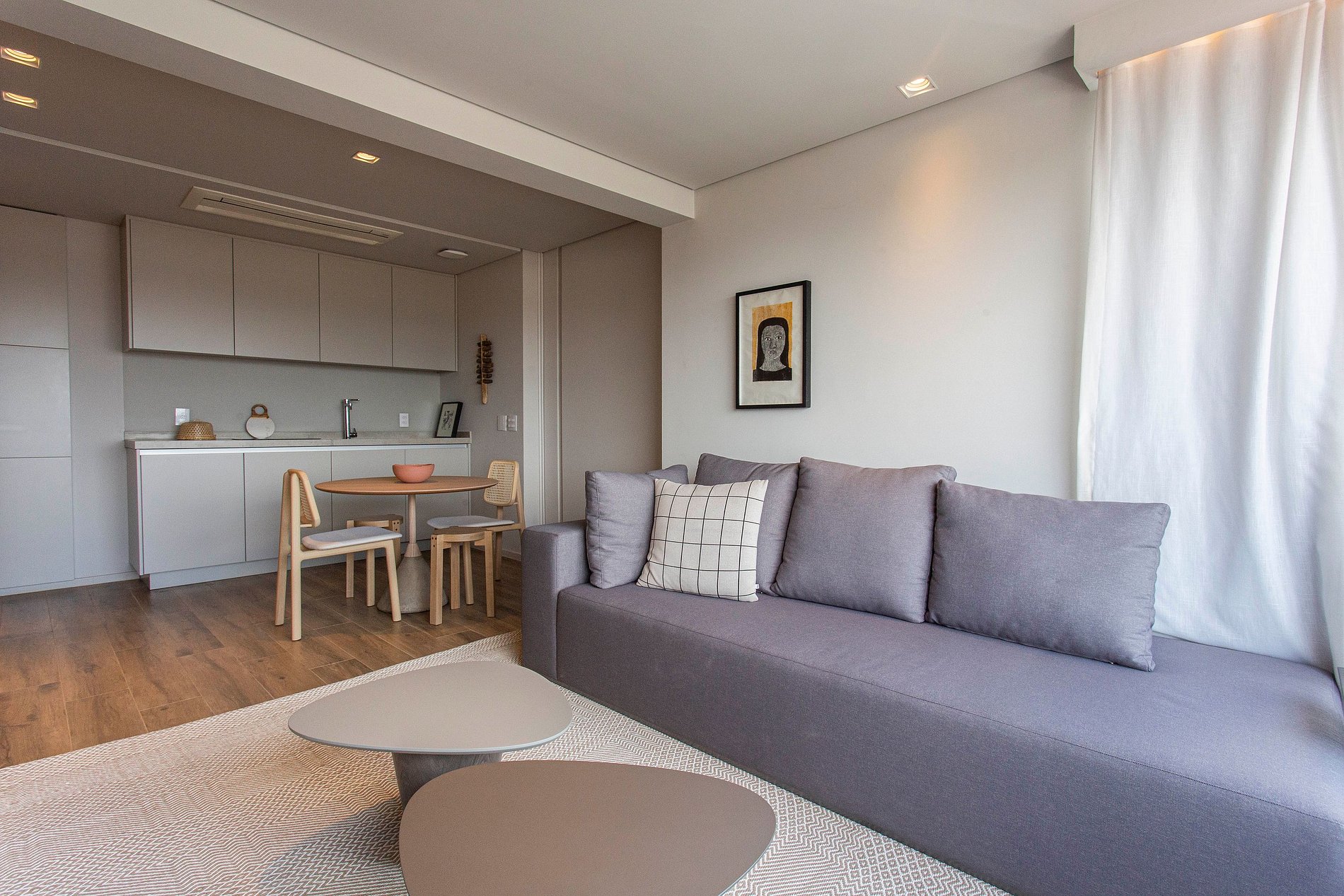 Sala de estar y cocina integradas, conexión a internet rápida, Smart TV de 50", cortinas blackout, sofá amplio, aire acondicionado y cocina totalmente equipada.