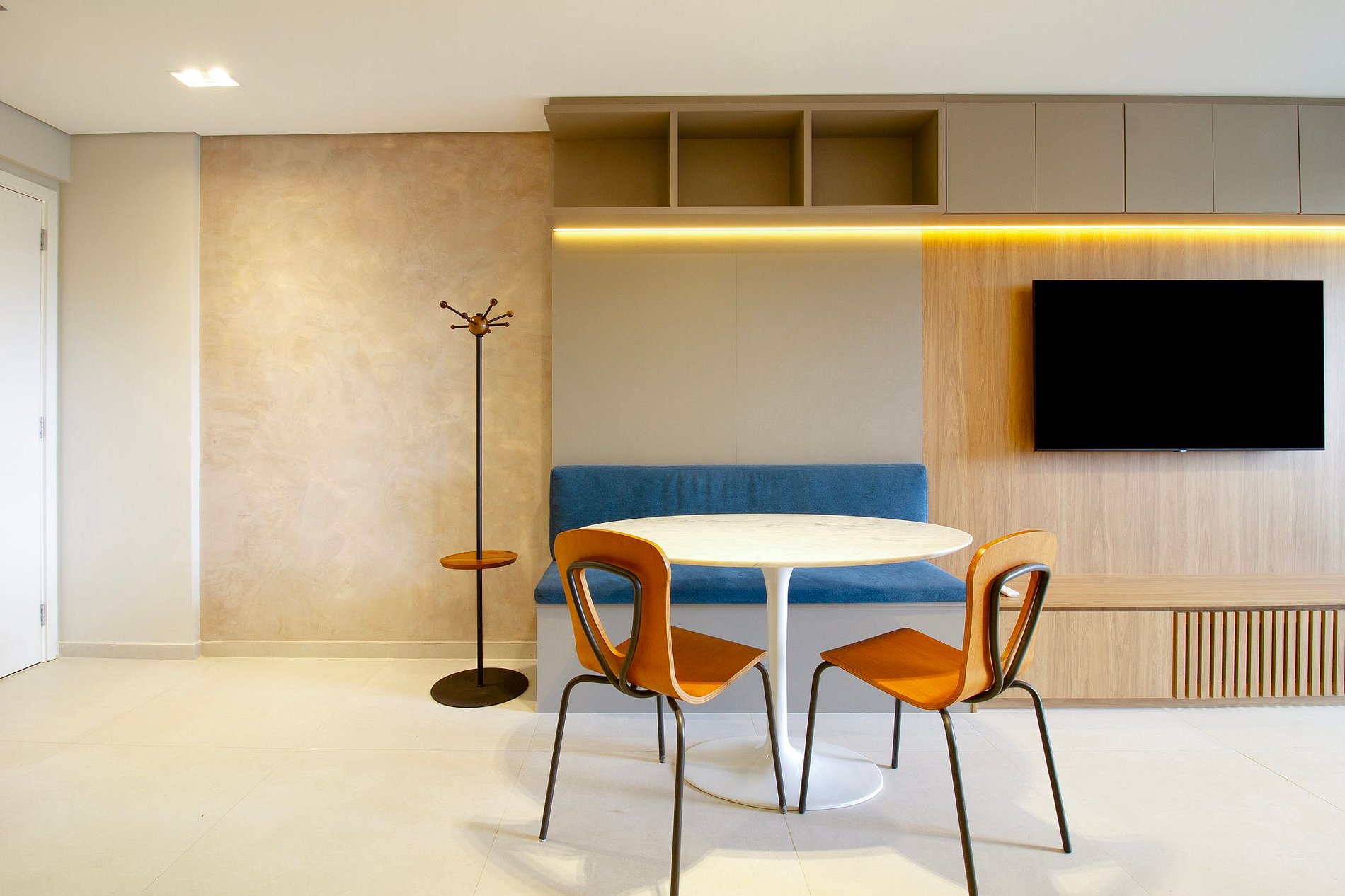 La sala de TV es luminosa y espaciosa, integrada con el balcón, que incluye un escritorio y una cocina totalmente equipada. Cuenta con un Smart TV de 50", internet de alta velocidad y aire acondicionado.