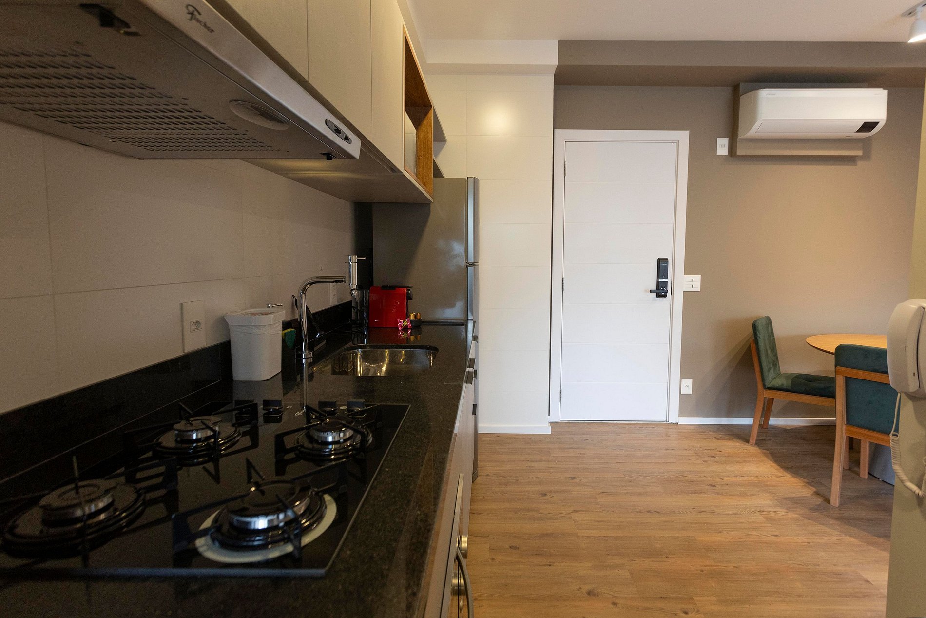 Dispone de una suite de ensueño con balcón, aire acondicionado, blackout, Wi-Fi, Smart TV, lavadora/secadora, lencería de alta calidad, cocina equipada y mesa ideal para home office.