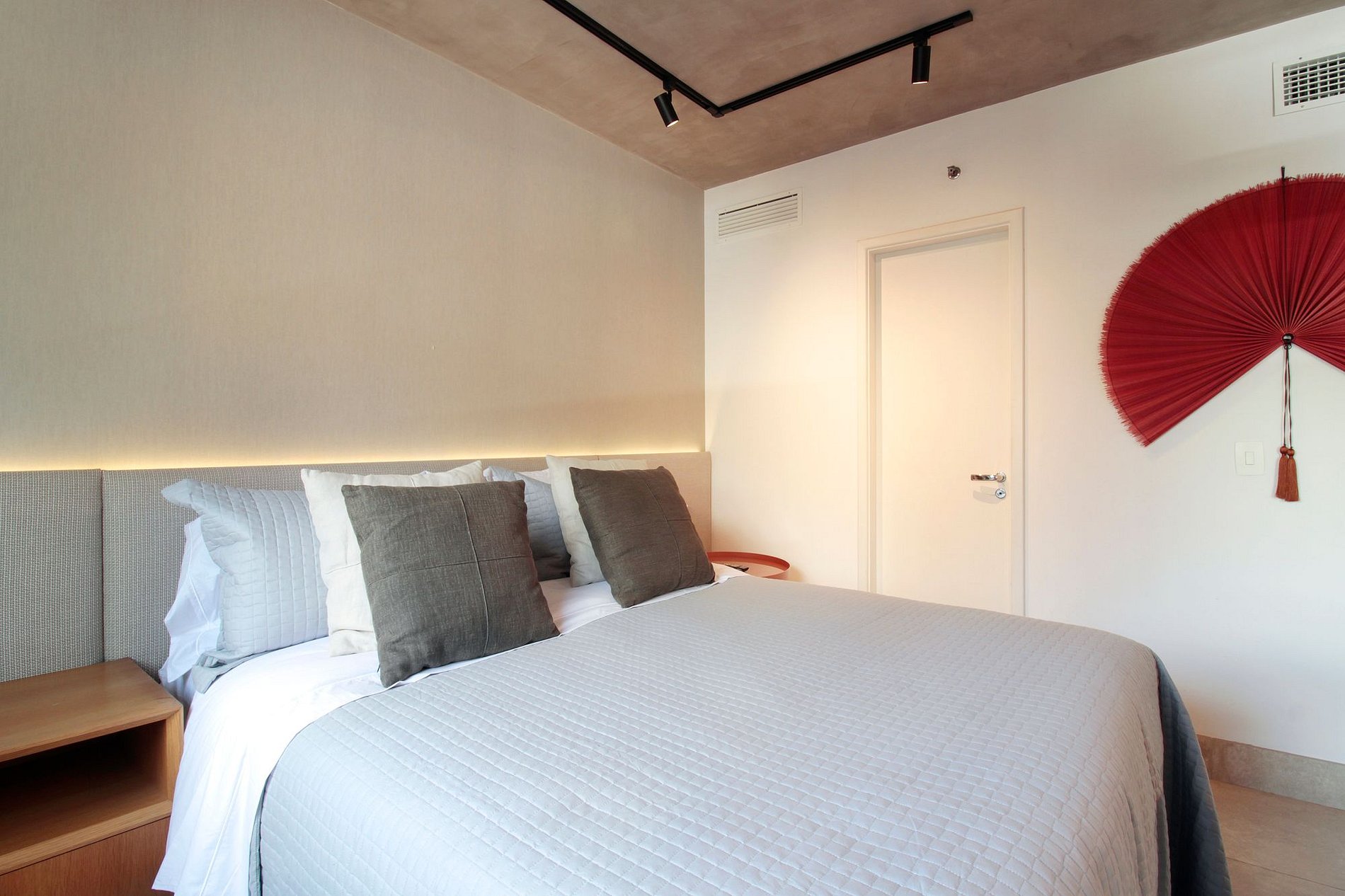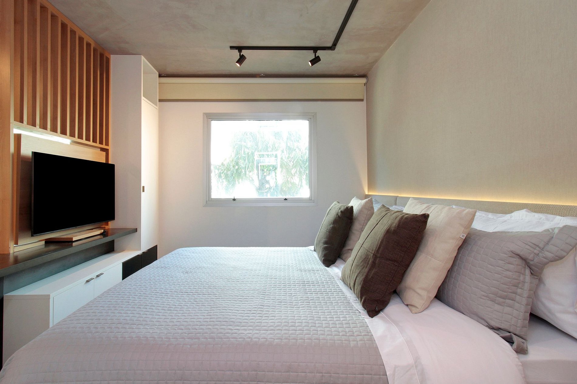 Cuenta con cortinas opacas, internet rápido, Smart TV giratorio, aire acondicionado, ropa de cama premium y cocina totalmente equipada para tu comodidad.