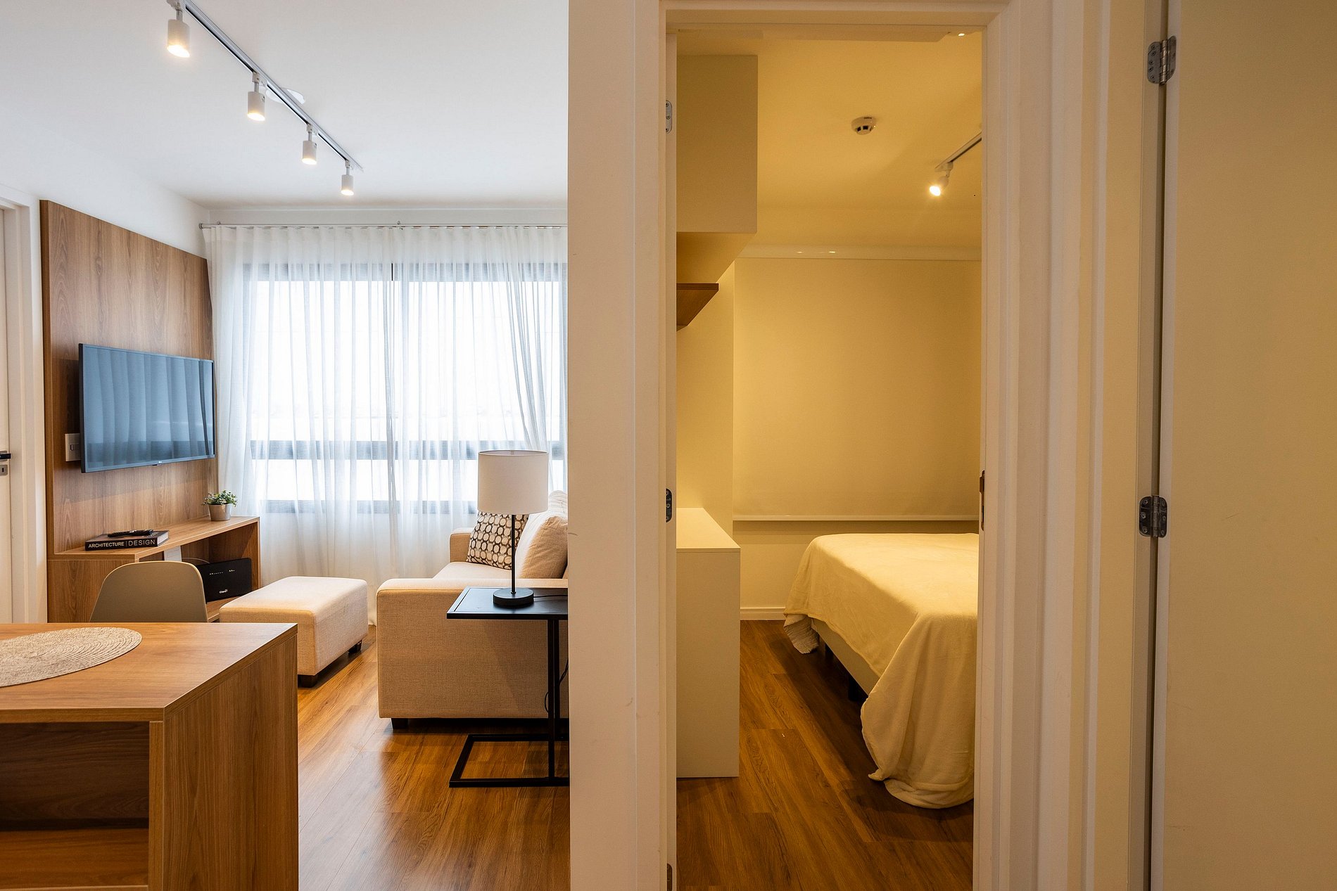 A sala conta com TV Smart, internet de alta velocidade, janela ampla e integração com a cozinha, que é bem equipada.