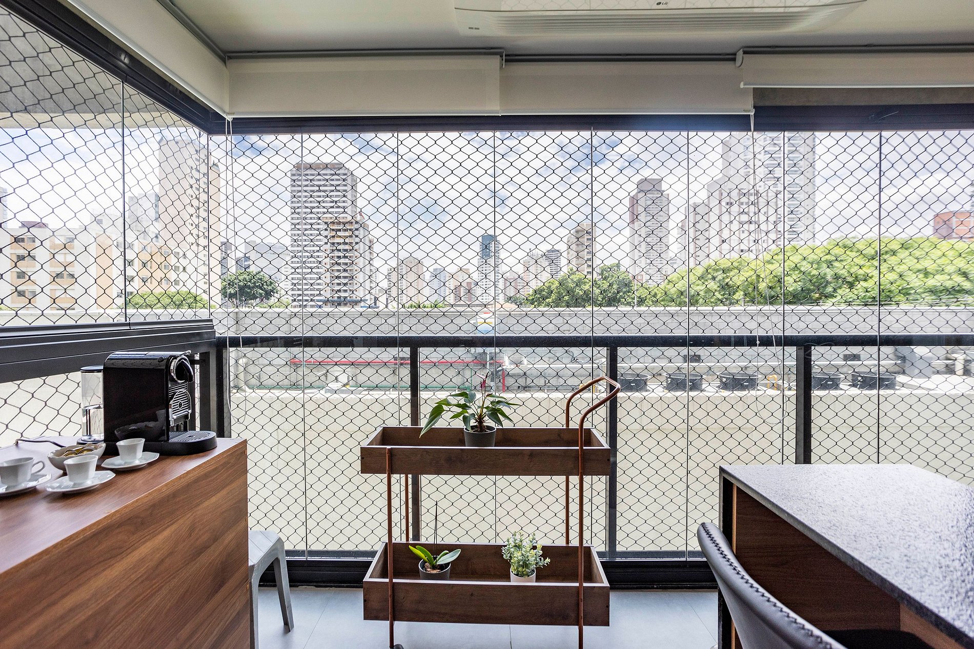 A sala é bem arejada, com TV Smart e a cabo, sofa-chaise, ar condicionado e integrada com a cozinha, super equipada.