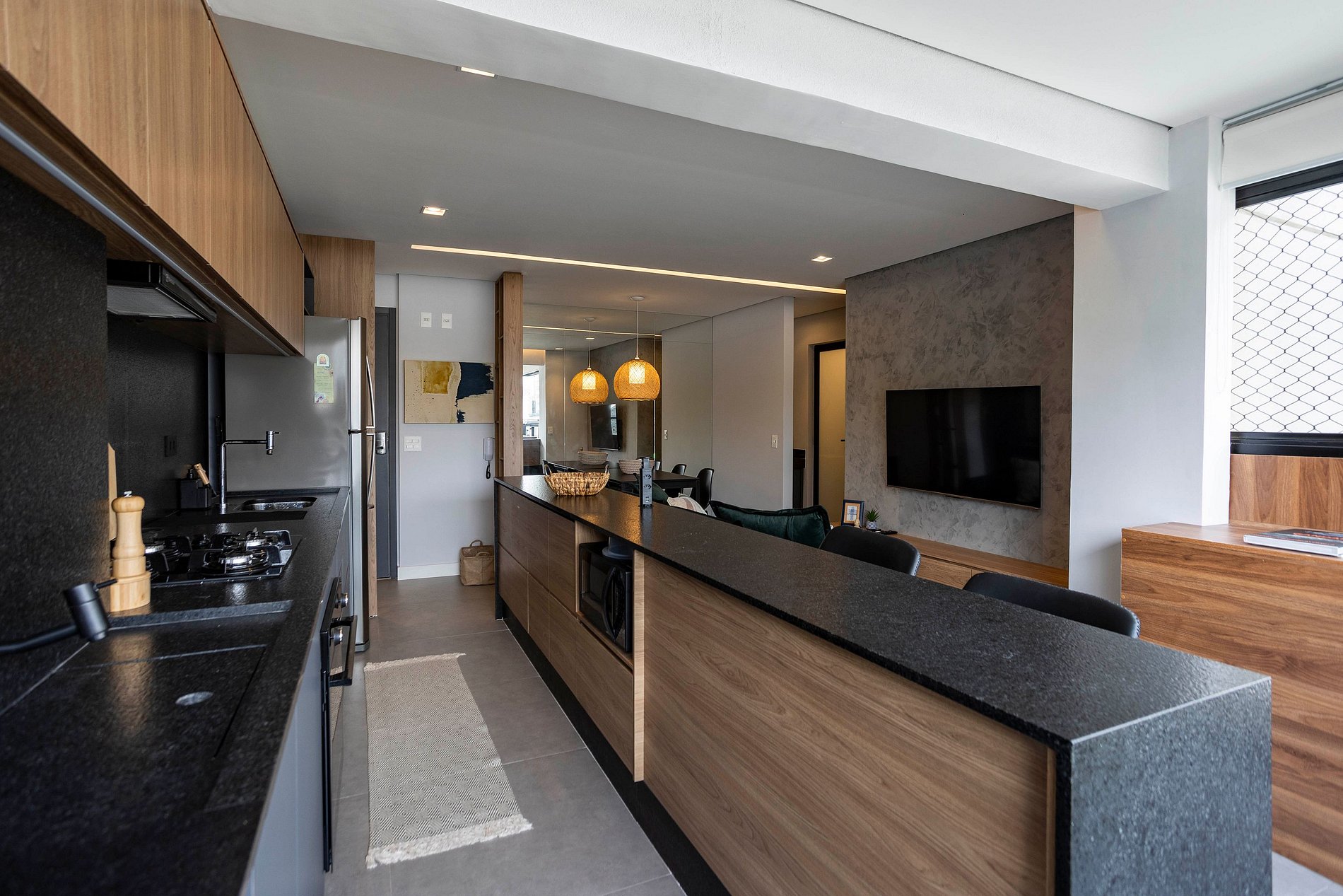 A sala é bem ventilada, com Smart e TV a cabo, sofá-chaise, ar condicionado e integrada com a cozinha, que é super equipada.