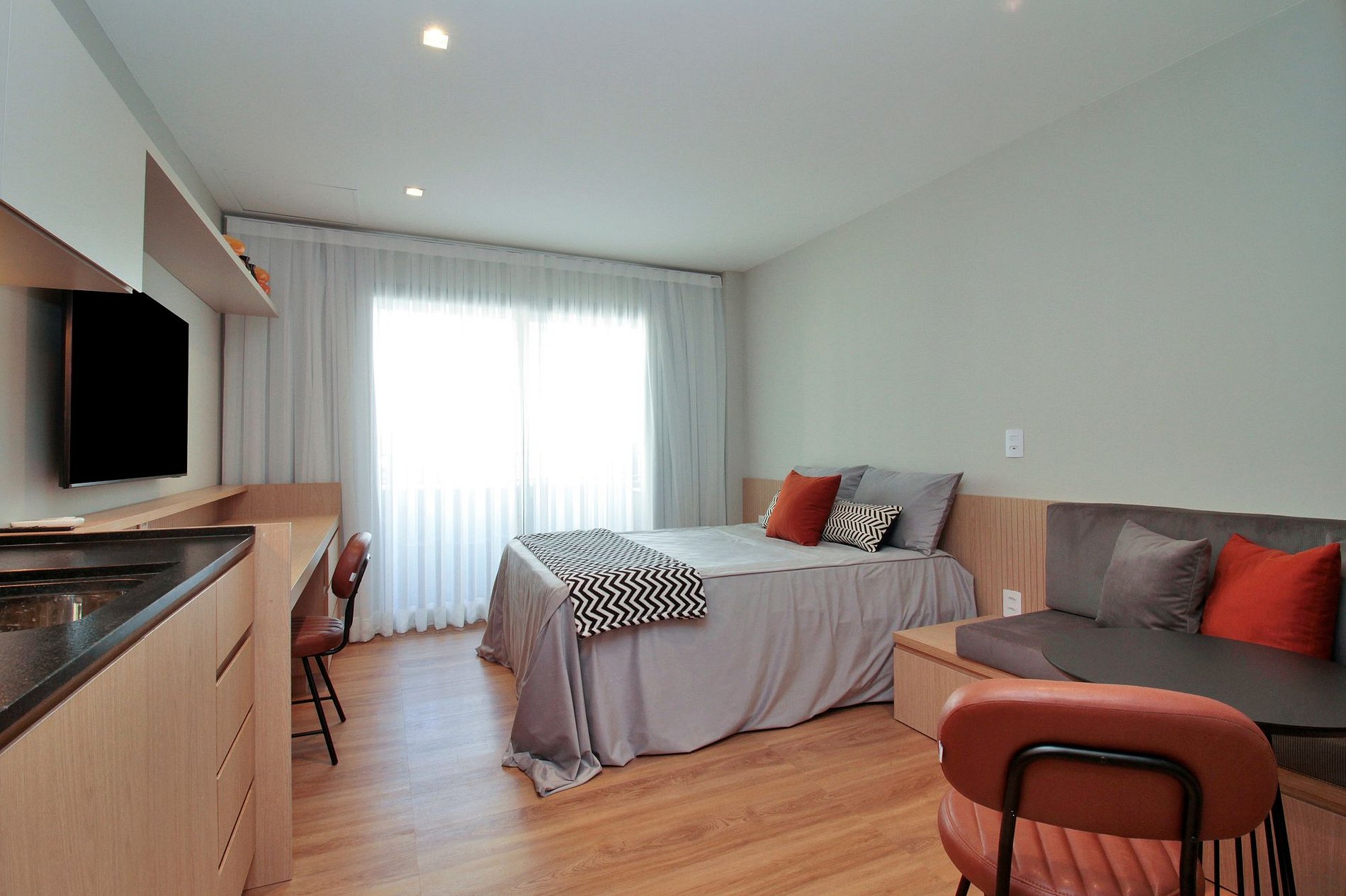 O estúdio foi projetado para atender a todos os tipos de hospedagem. Por isso, a cozinha é totalmente equipada, incluindo forno, e os enxovais possuem qualidade diferenciada, proporcionando muito conforto.