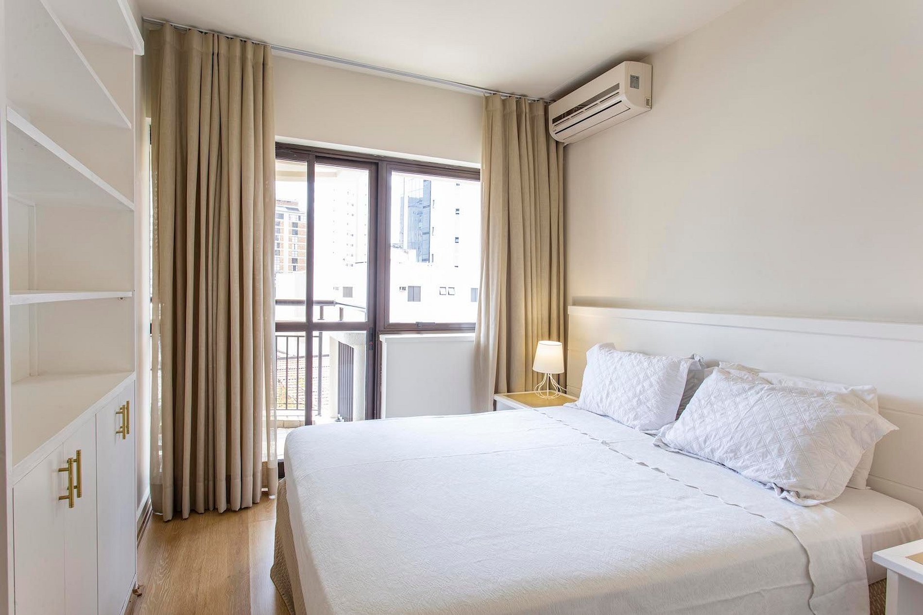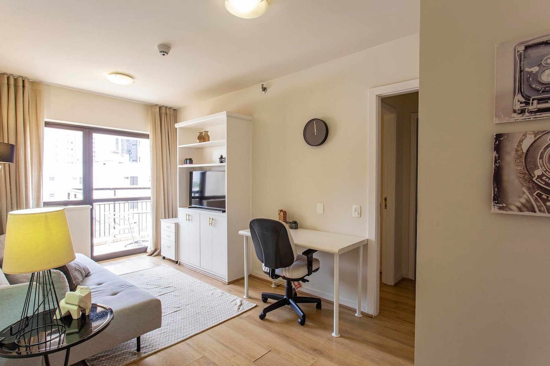 Flat de 45 m², charmoso e acolhedor, em hotel recém-reformado e elegante no Itaim. Conta com varanda, Wi-Fi, ar-condicionado, blackout, Smart TV, limpeza diária básica e uma vaga de garagem.