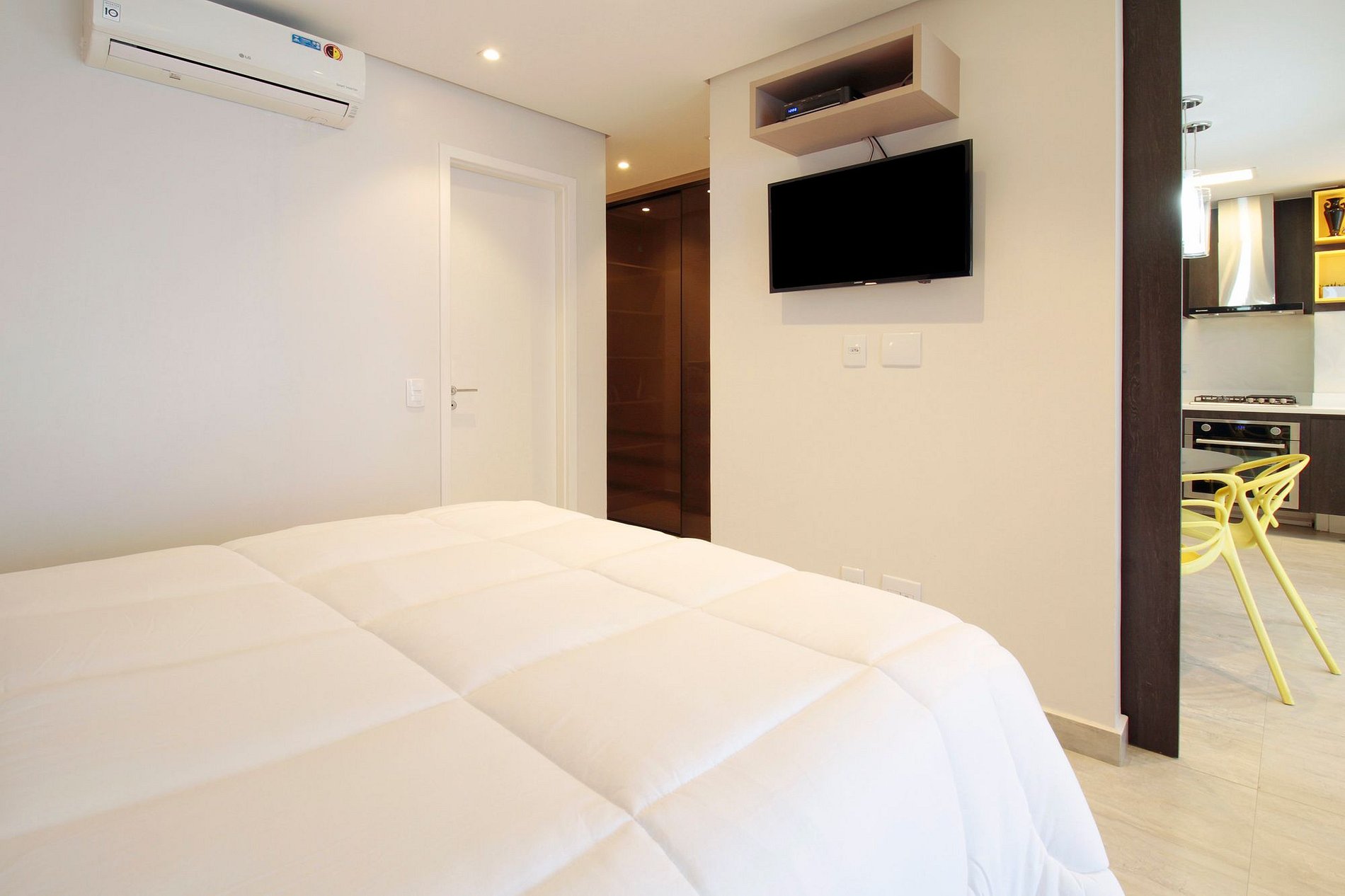 A suite tem blackout, TV Smart, excelente enxoval, chuveiro delicioso, além de 1 vaga de garagem e serviço básico de arrumação diária, durante a semana, sem custo adicional.