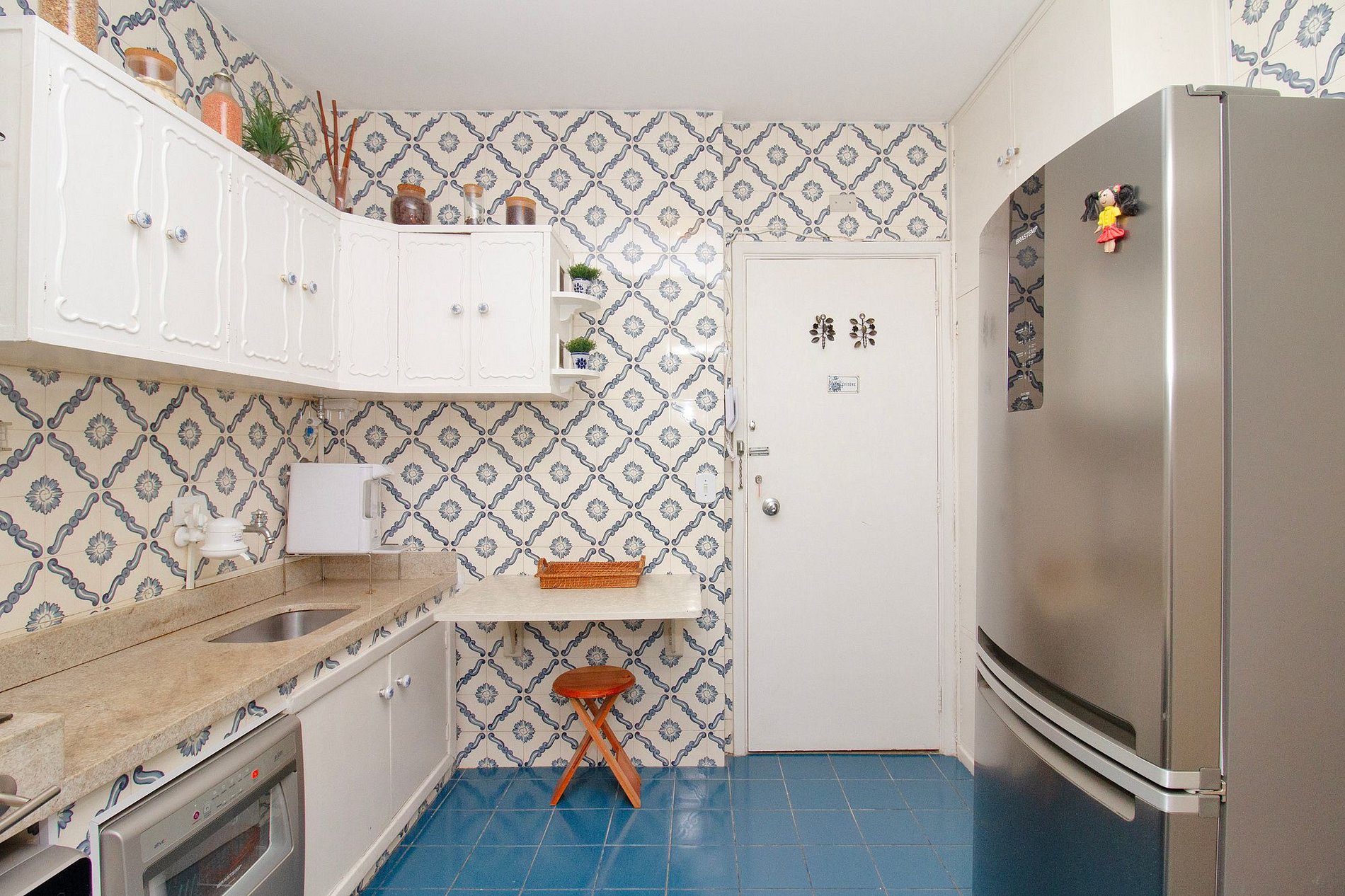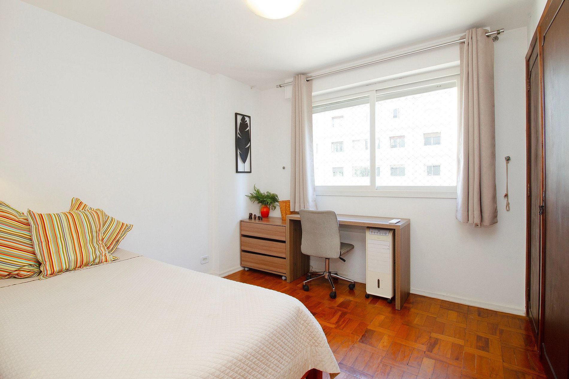 A sala é iluminada, voltada para a rua Haddock Lobo, com TV Smart, internet estável, mesa de jantar e ventilador. Cozinha completa e lavanderia moderna.