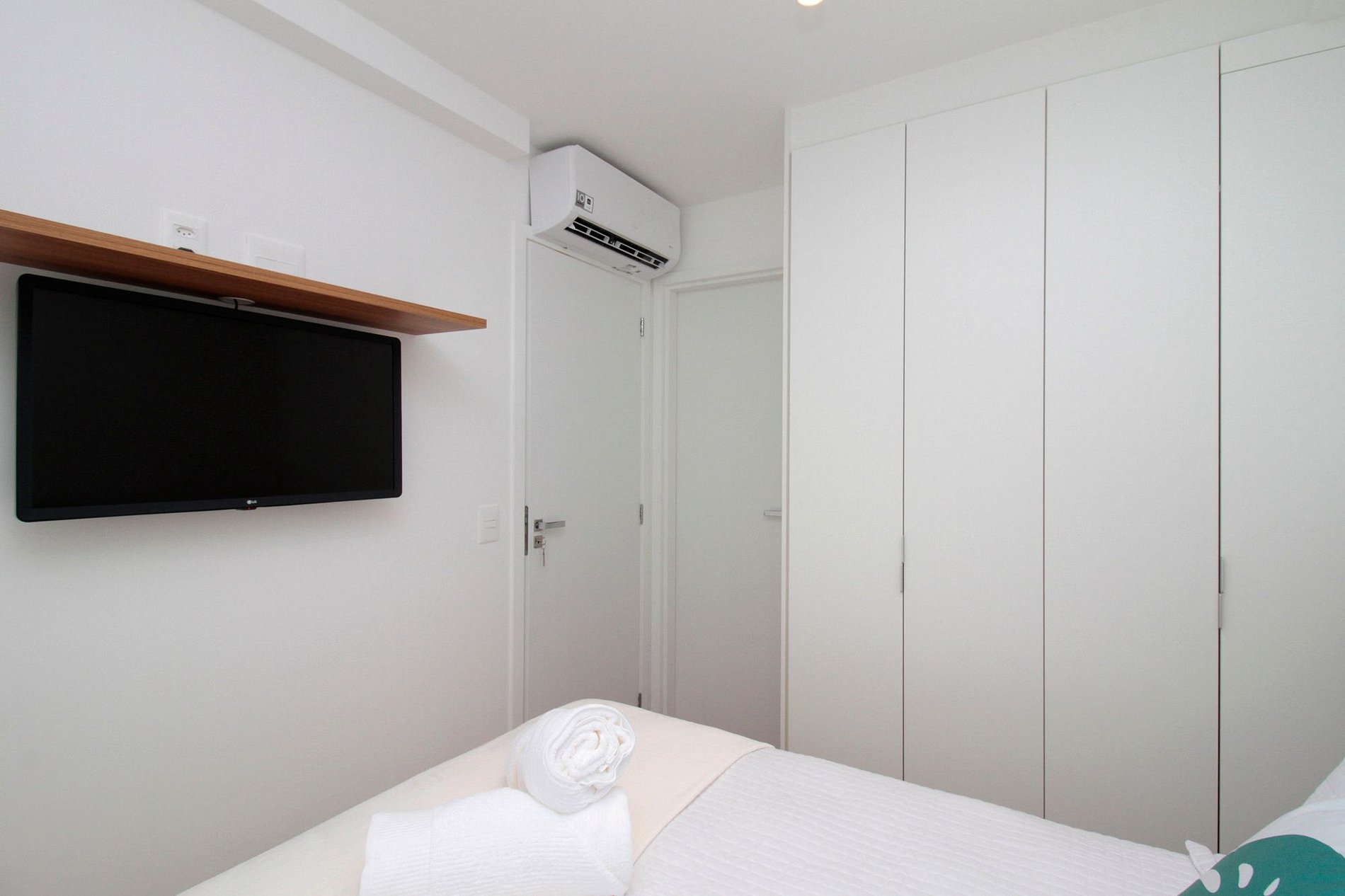 O primeiro quarto possui cama de casal, TV Smart e ar-condicionado.