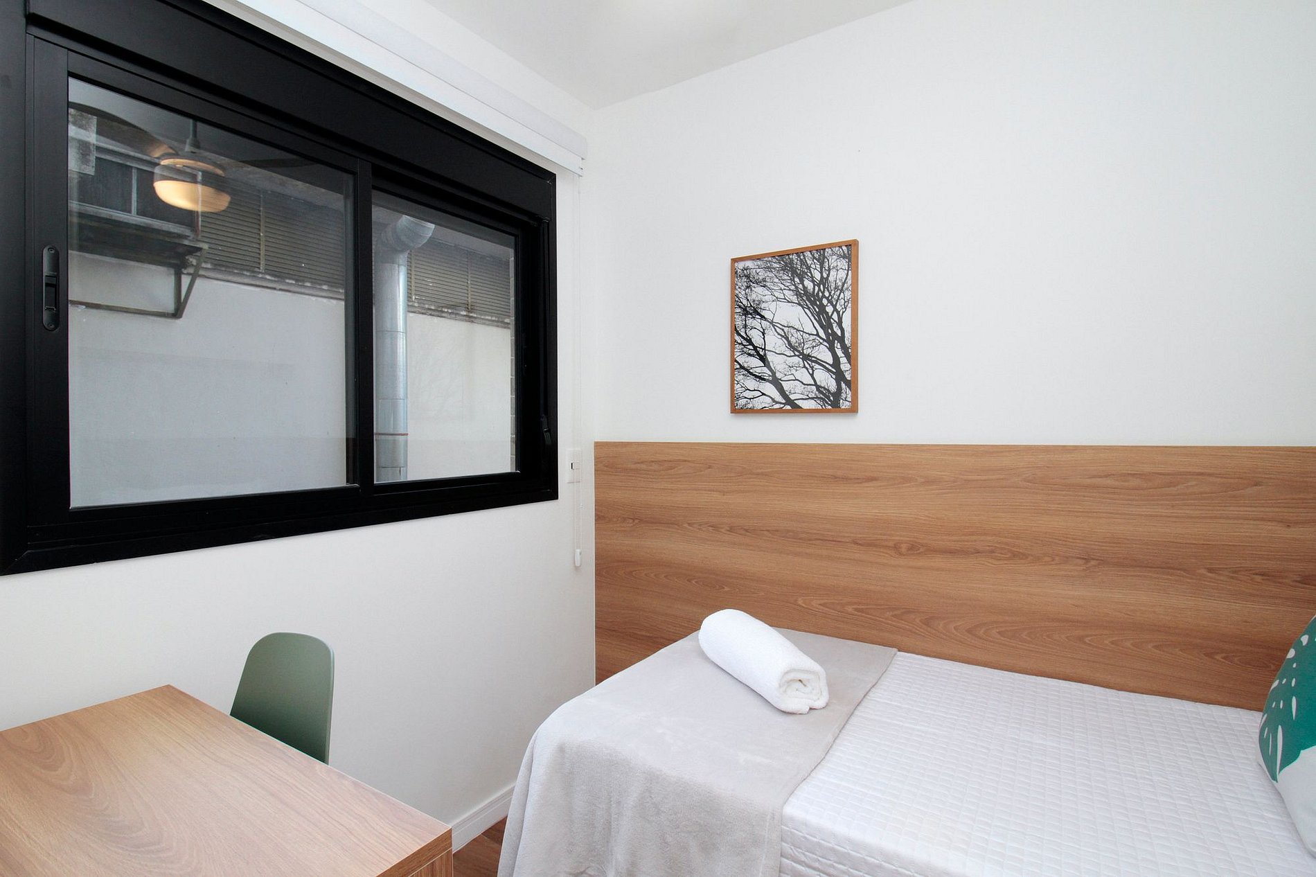 O segundo quarto oferece bicama, ventilador de teto e escrivaninha. Ambos possuem enxoval de qualidade, armário e cortinas blackout.