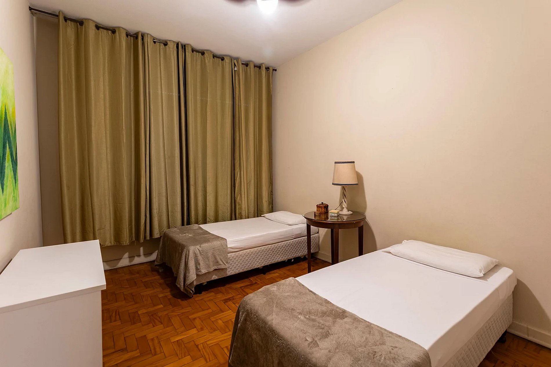 O apartamento é antigo, mas espaçoso, com quartos e sala confortáveis. Está completo e pronto para receber hóspedes. Não possui ar-condicionado, mas o pé-direito alto e as janelas grandes mantêm o ambiente fresco.