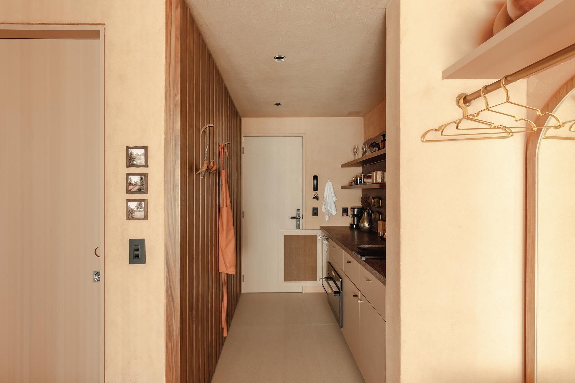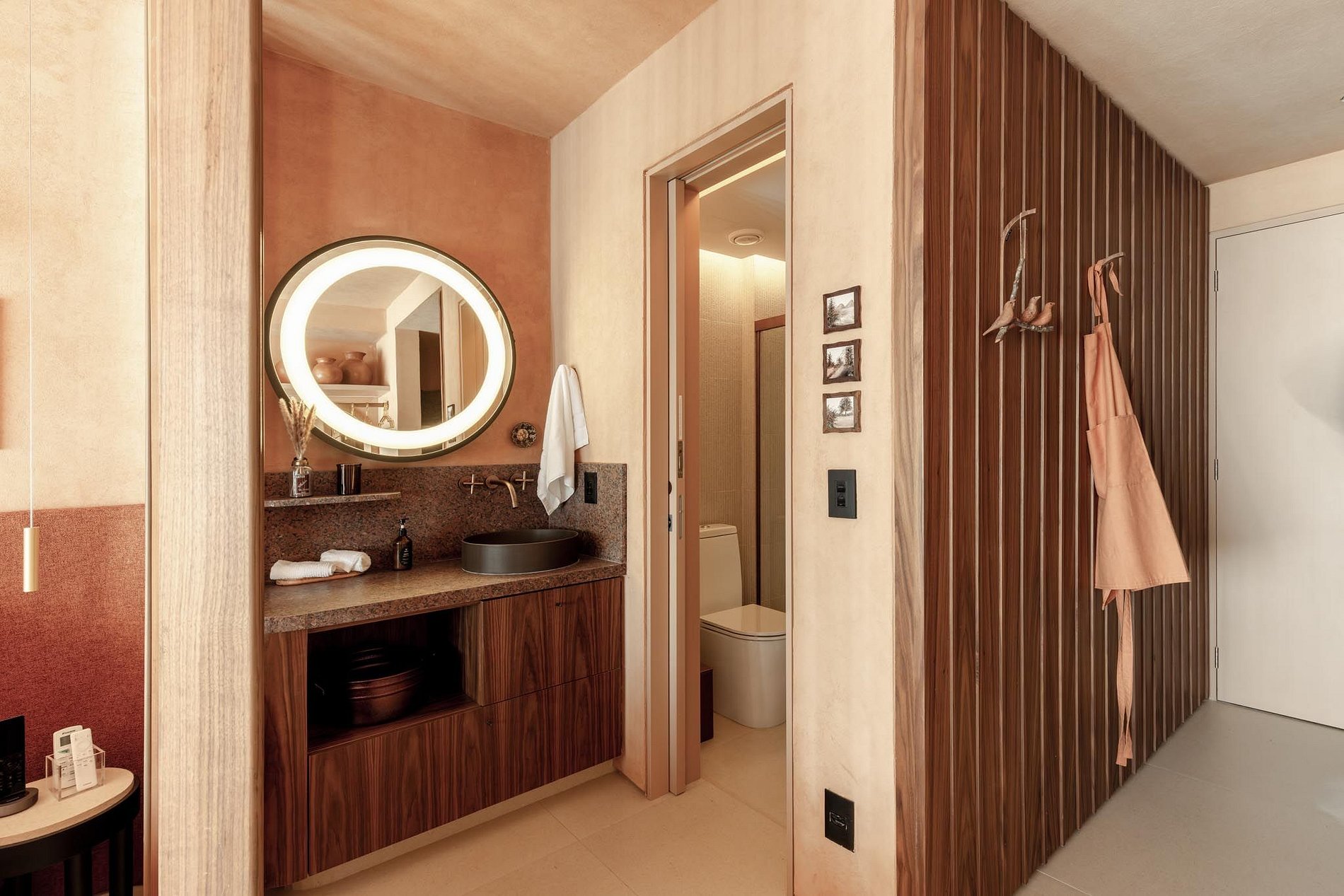 Com design autoral, paleta quente e tátil, iluminação dimerizável e automatizada e acabamentos naturais, o apartamento proporciona um refúgio sensorial em meio à cidade.