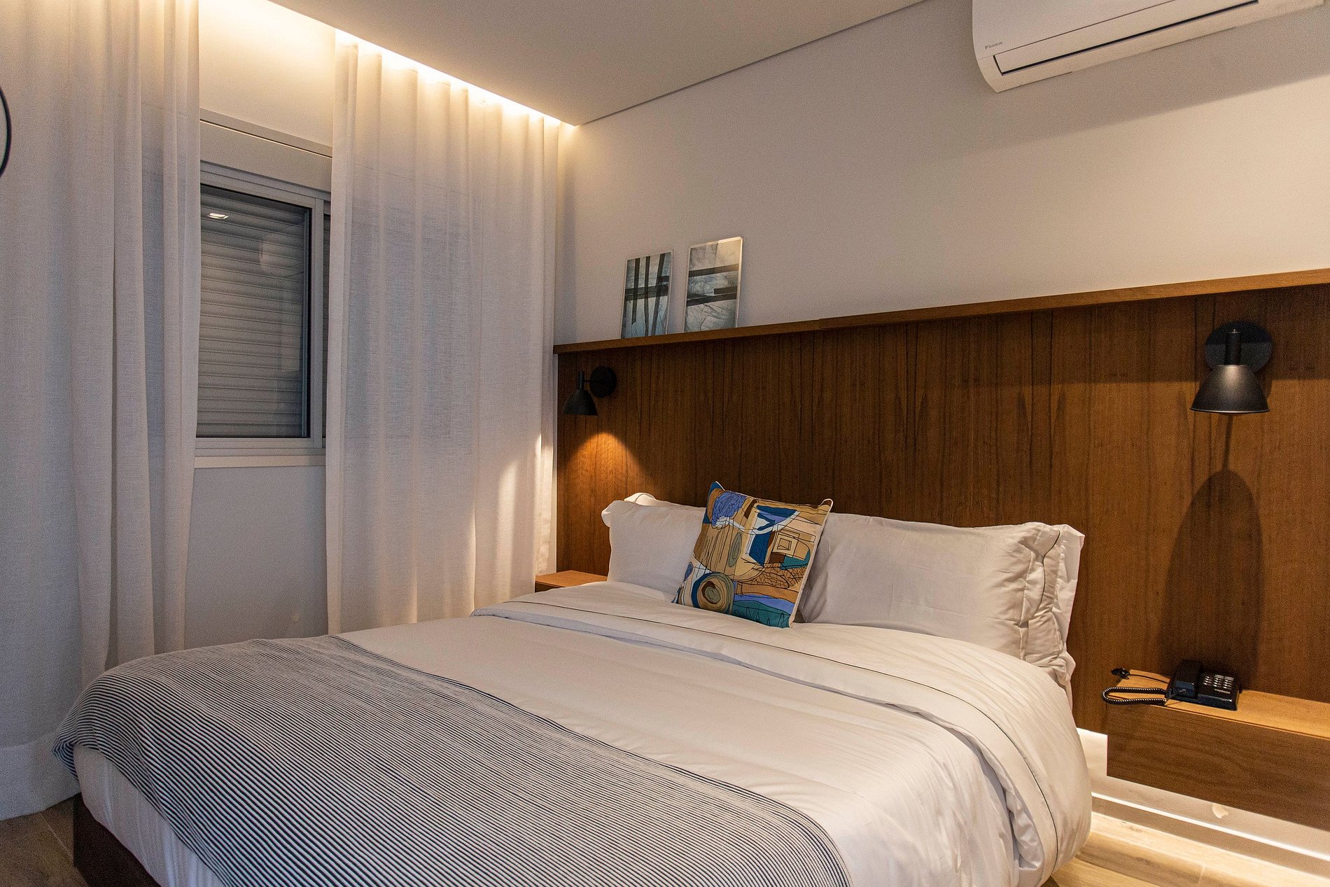 Na suite, cama queen, TV Smart, ar condicionado, blackout e excelentes enxovais.