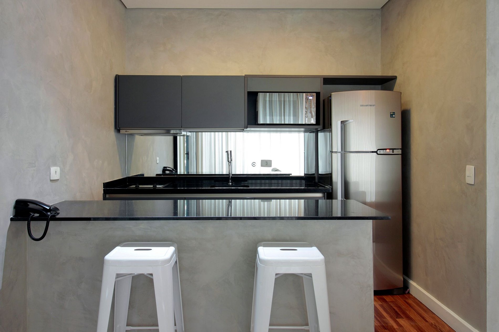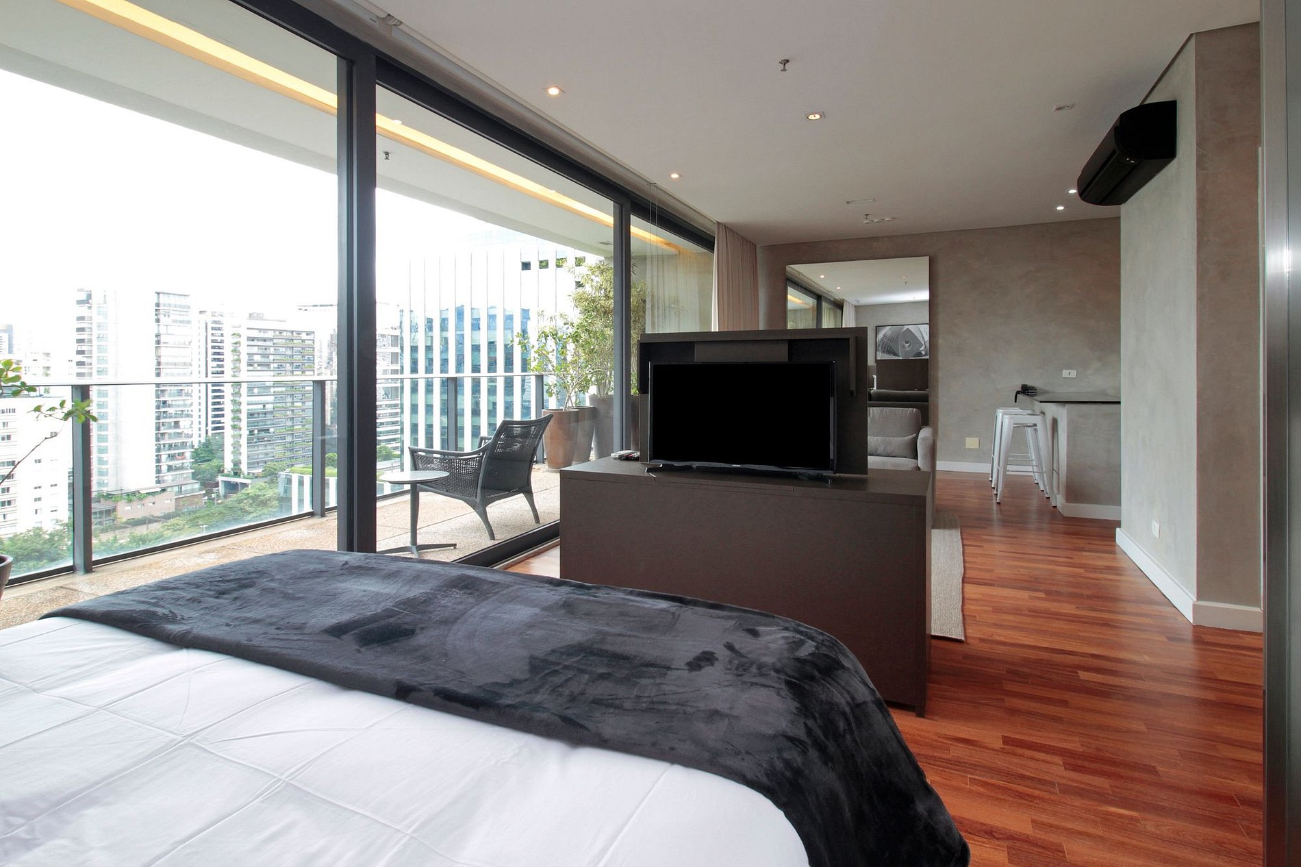 Estúdio sofisticado, com enxoval premium, atendimento atencioso da recepção e equipe de manutenção. Sinta-se em casa com o conforto de um hotel.