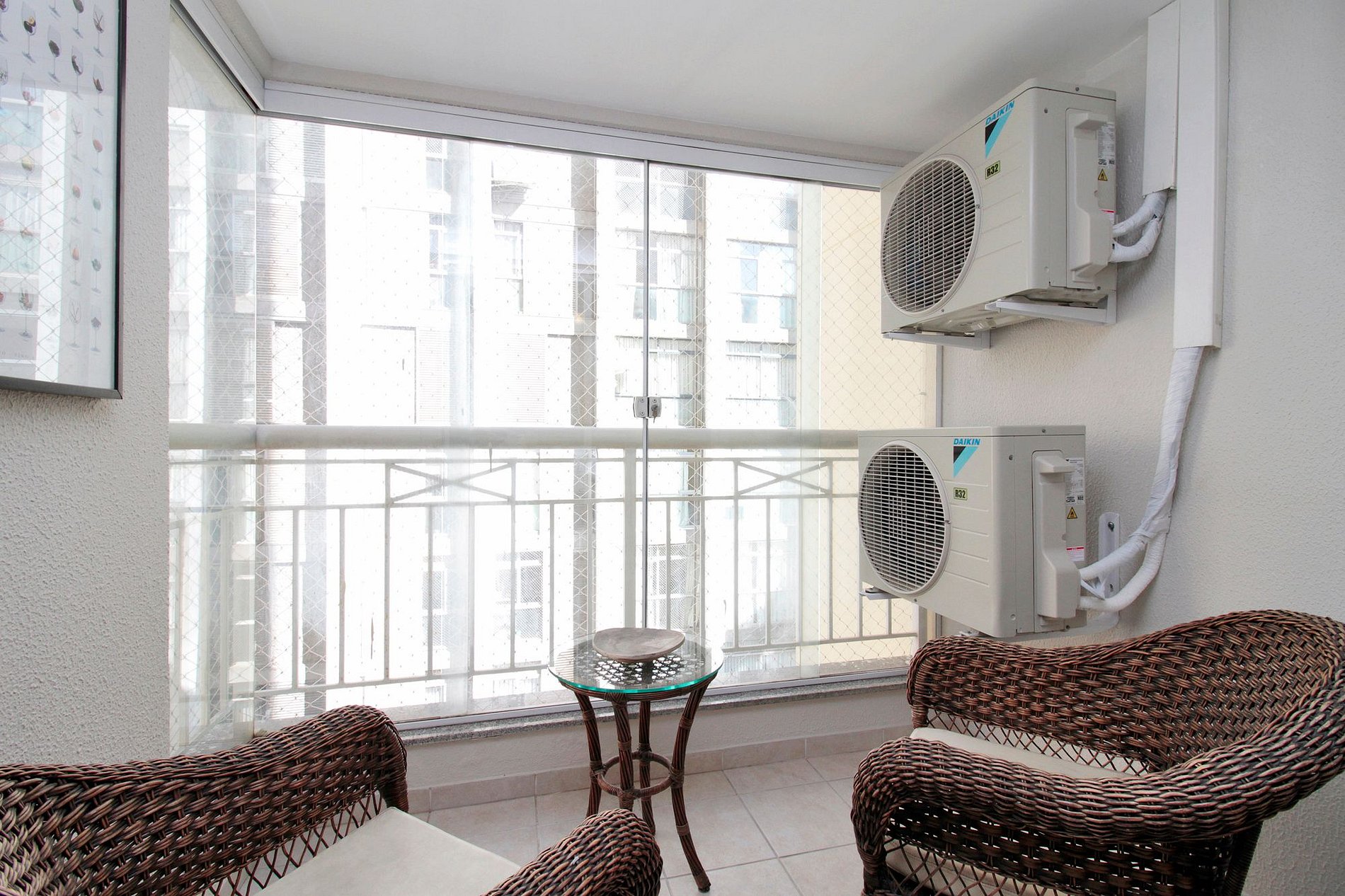 Sala ampla integrada à varanda, ar-condicionado, TV Smart, TV a cabo, internet e cozinha completa com máquina de lavar.