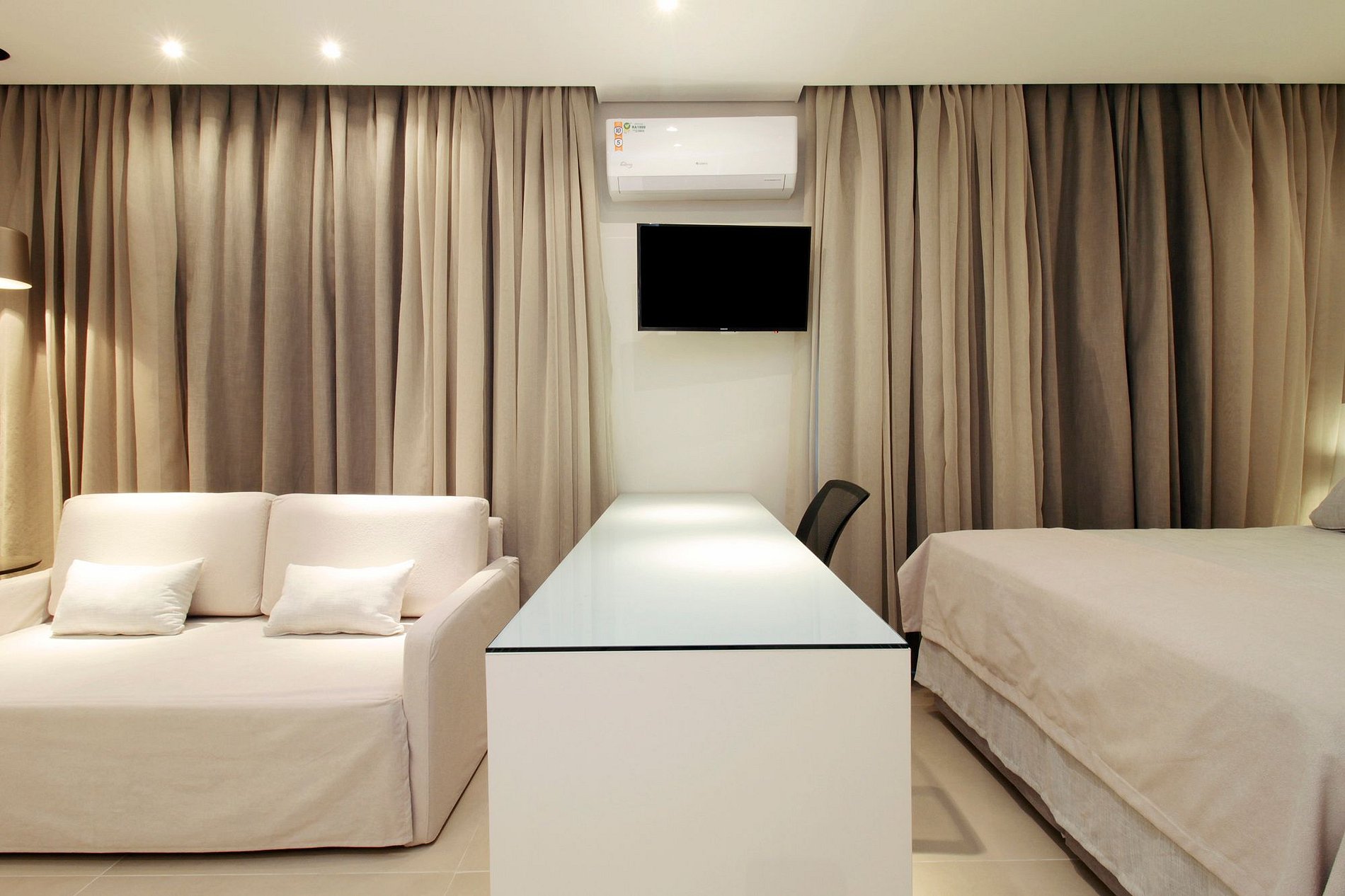 Cama queen, enxoval de alta qualidade, cortina blackout, armário e TV Smart garantem o seu conforto.