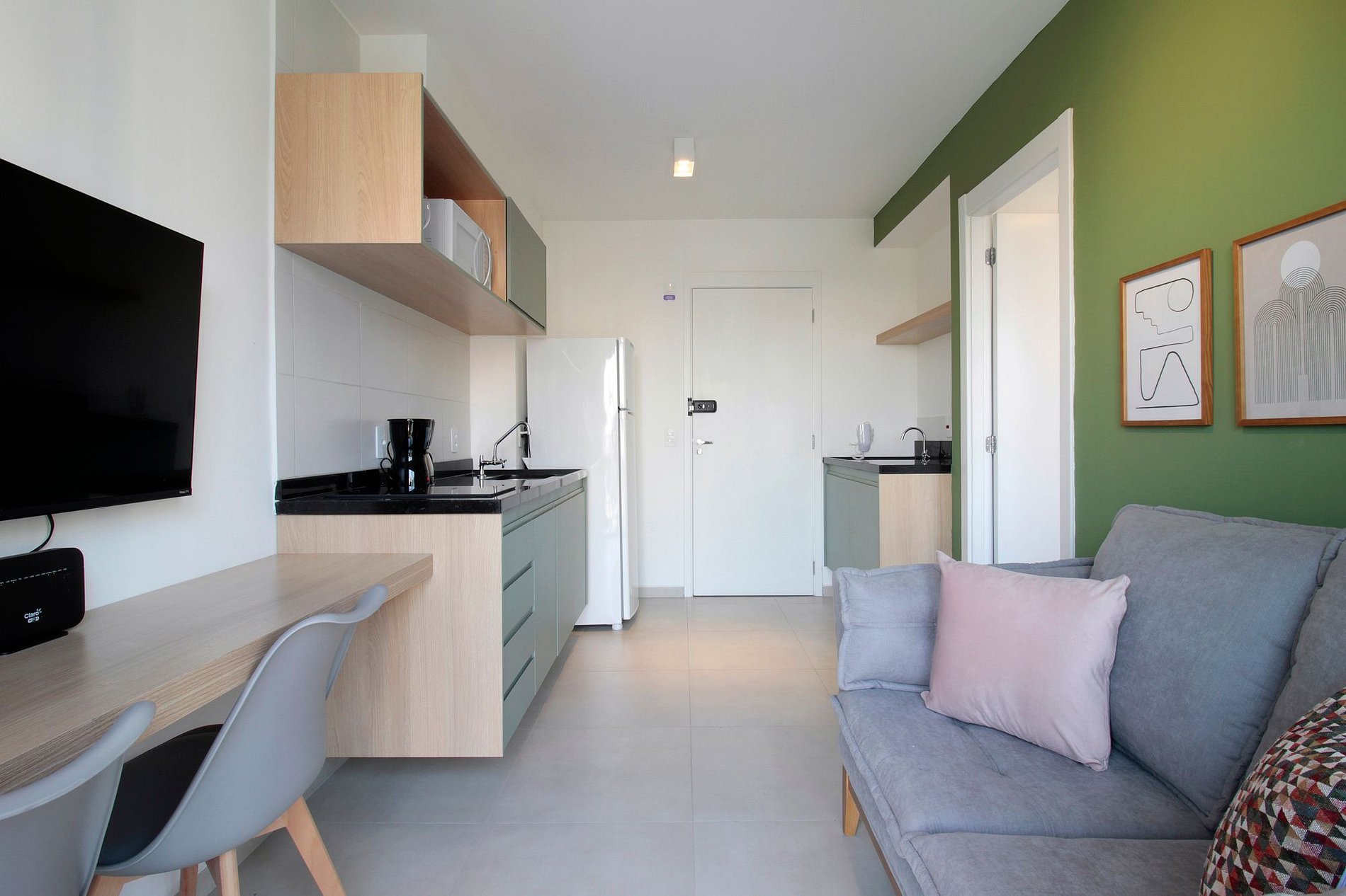 A sala, integrada com a cozinha completa, possui Smart TV, espaço para refeições e home office e uma varandinha com uma linda vista.