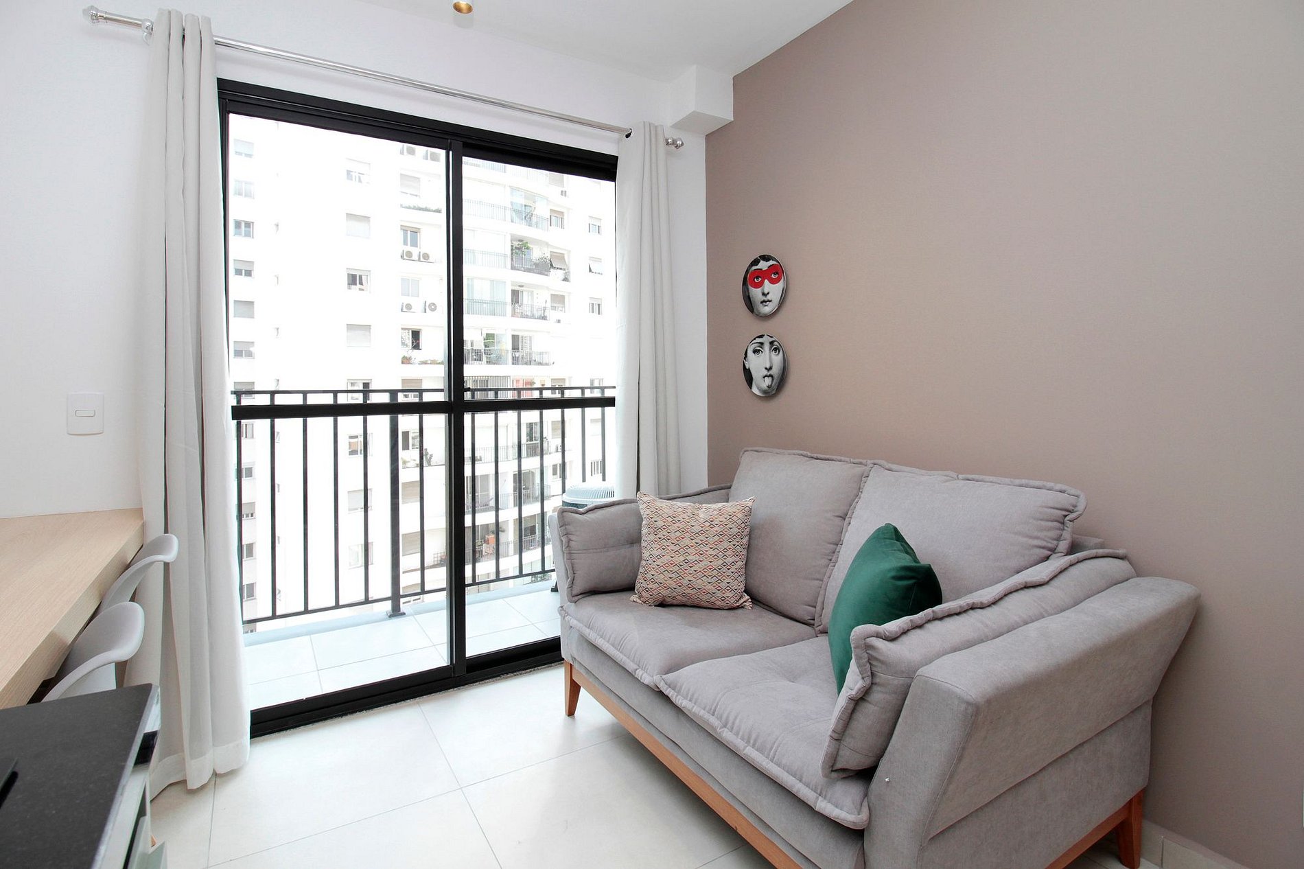 A sala integrada à cozinha possui Smart TV, espaço para refeições, home office e varanda com bela vista.
