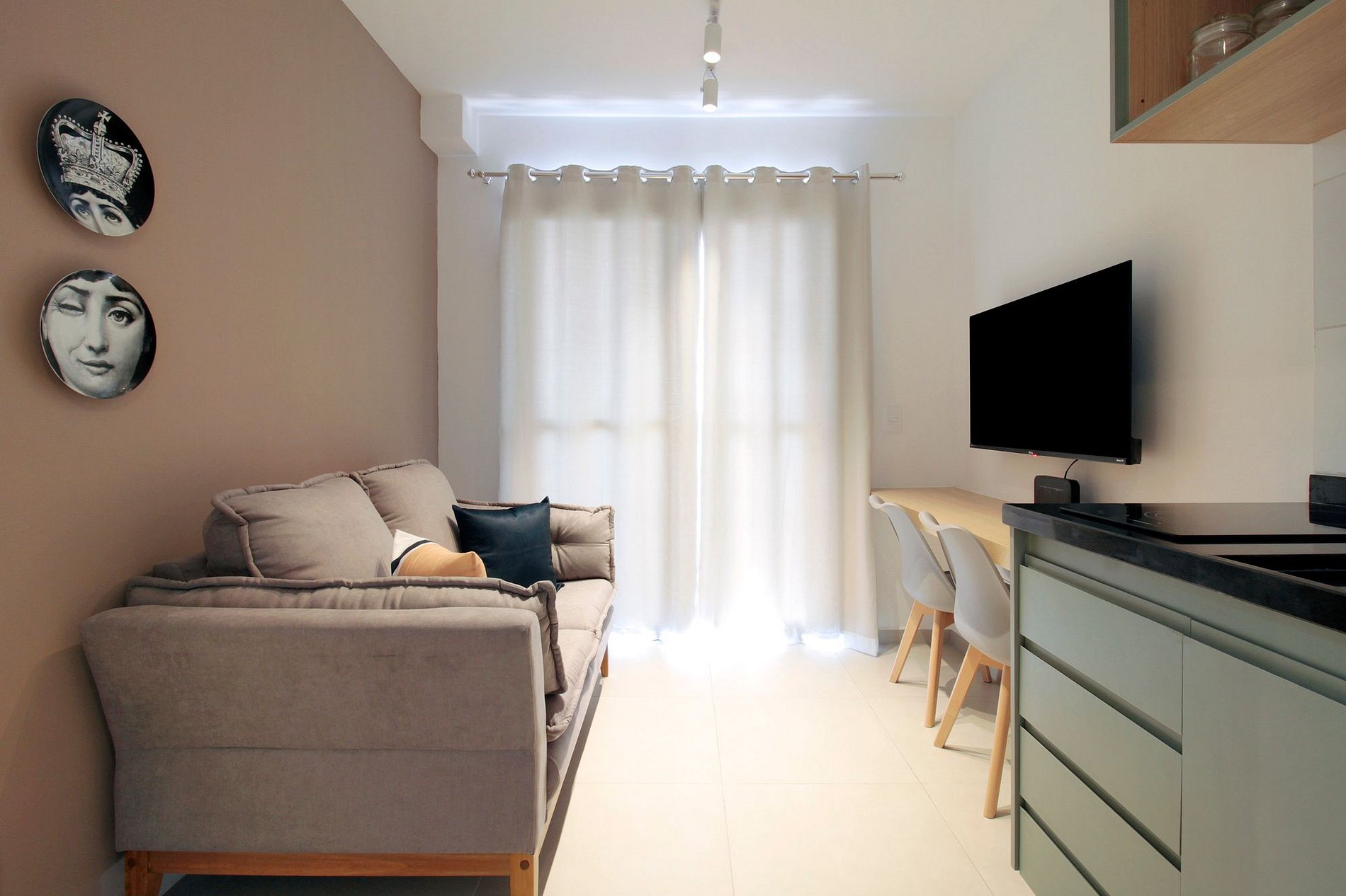 A sala, integrada à cozinha equipada, oferece Smart TV, espaço para refeições, home office e uma varanda com bela vista.