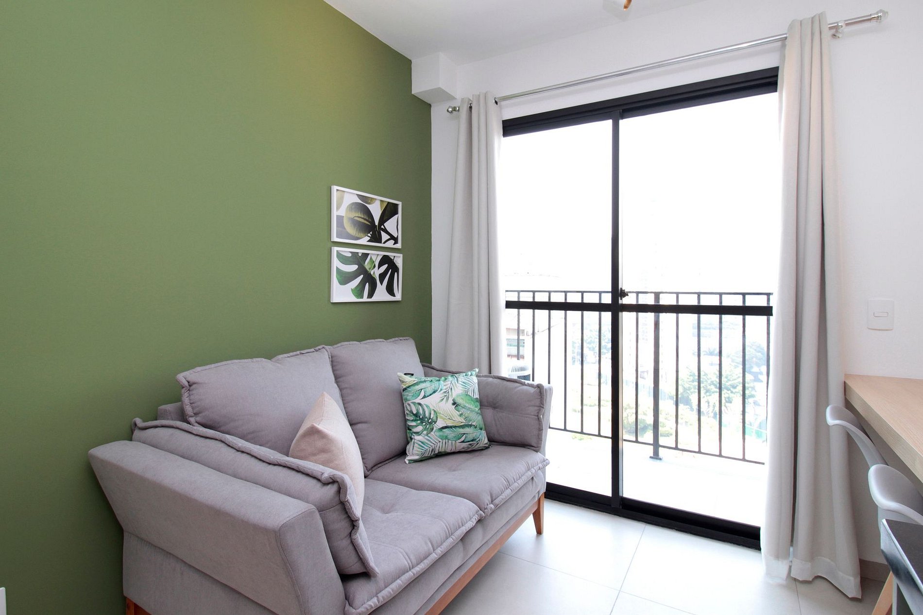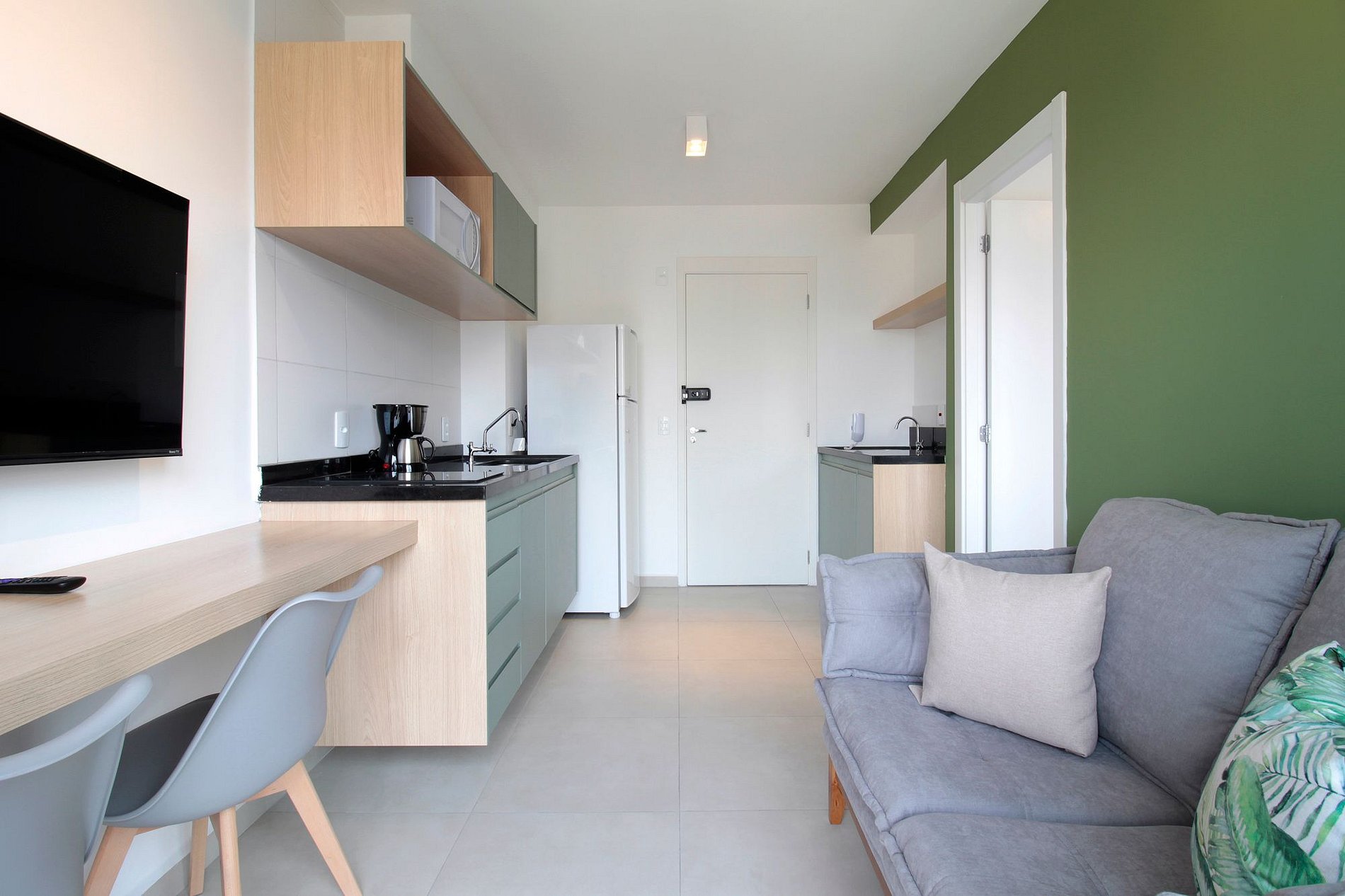 A sala, integrada à cozinha equipada, conta com Smart TV, espaço para refeições, home office e uma varanda com bela vista.