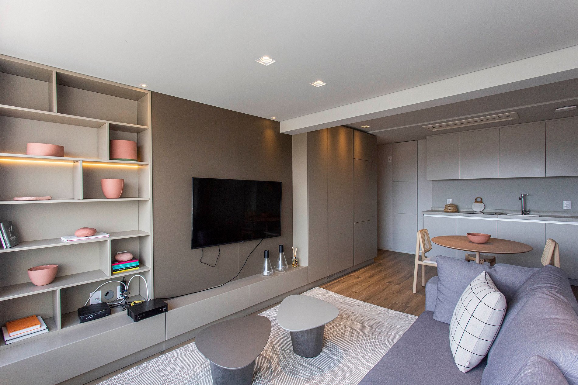 Sala e cozinha integradas, internet rápida, Smart TV de 50", cortina blackout, sofá espaçoso, ar-condicionado e cozinha completa.