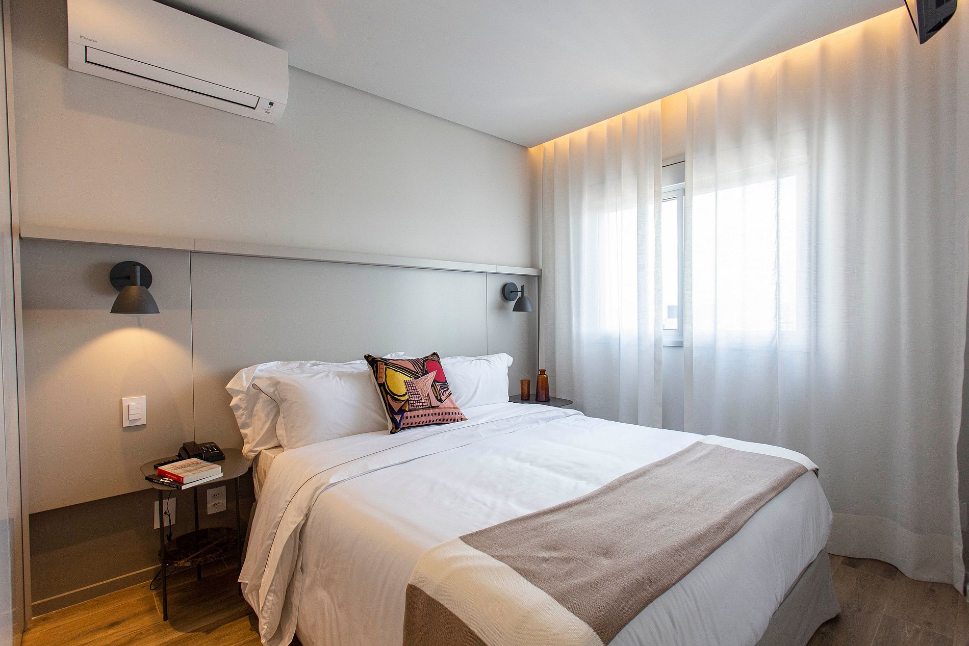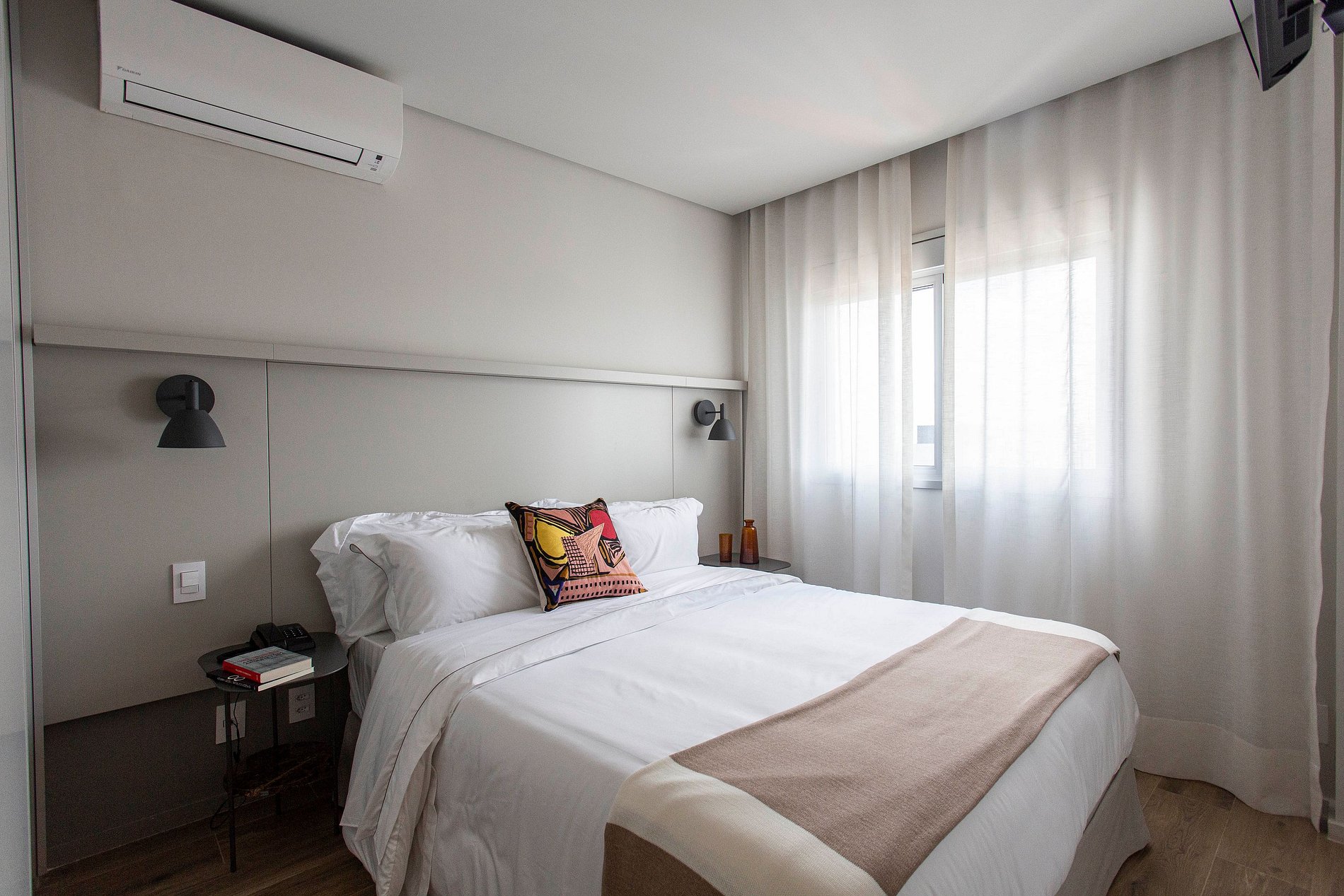 Suíte com cama queen, Smart TV, ar-condicionado, cortina blackout e enxoval de alta qualidade.