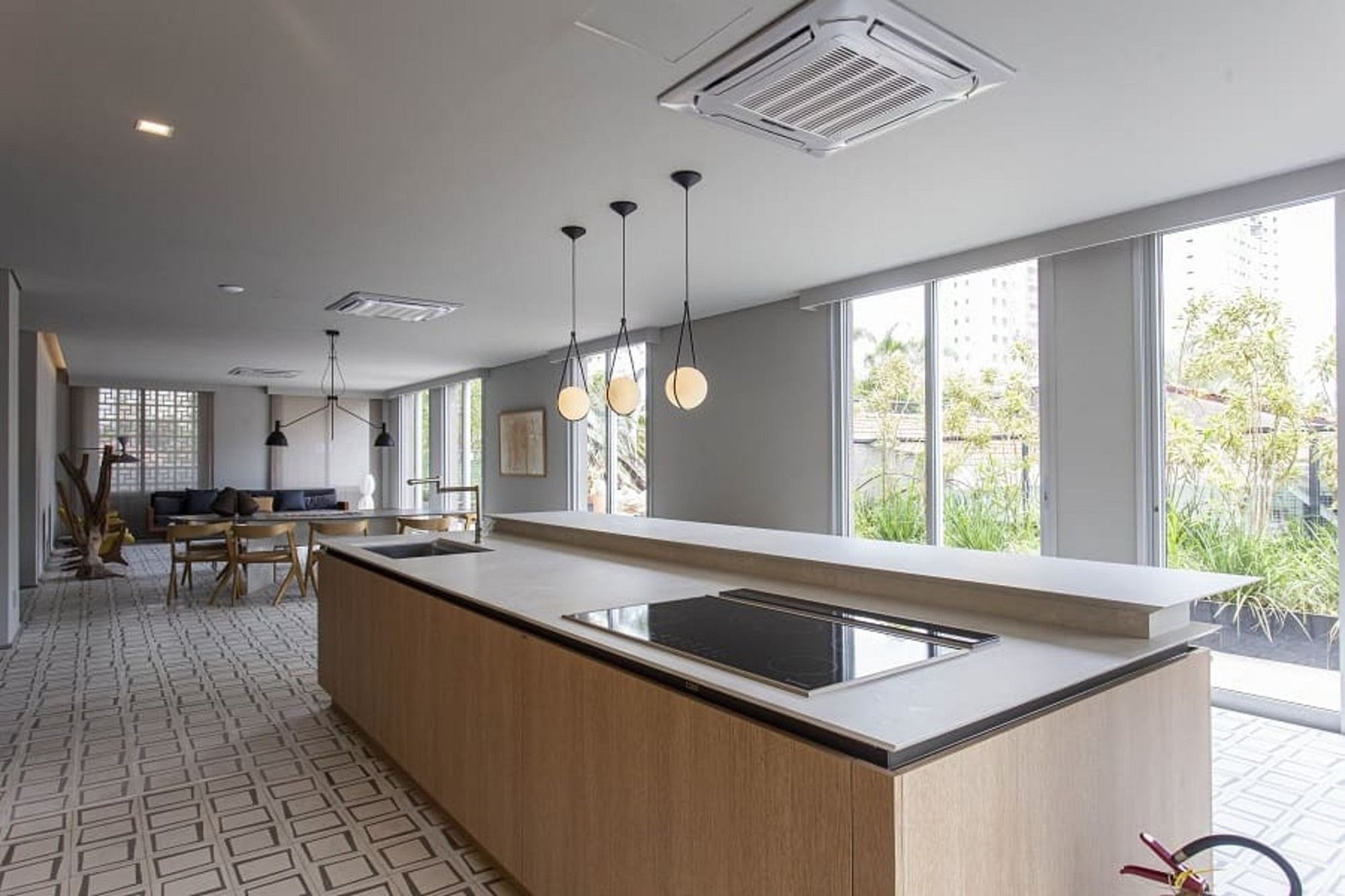 Sala integrada à cozinha, com internet de alta velocidade, TV Smart de 50", blackout, sofá amplo, ar-condicionado e cozinha equipada.