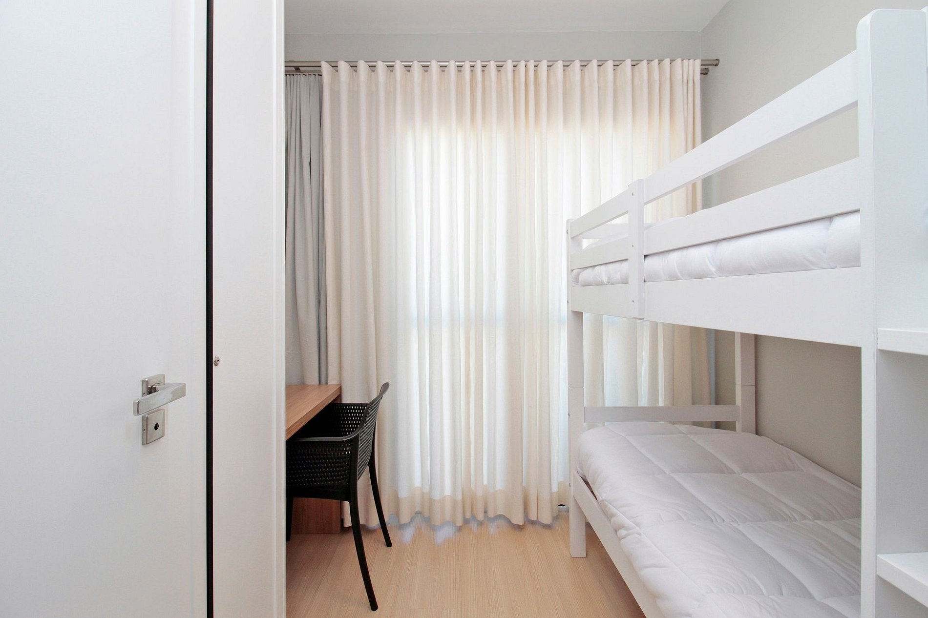 São dois dormitórios com ar-condicionado, enxovais de qualidade e blackout. Um dos quartos possui cama de casal e, o outro, possui beliche e mesa de escritório, ideal para home office.