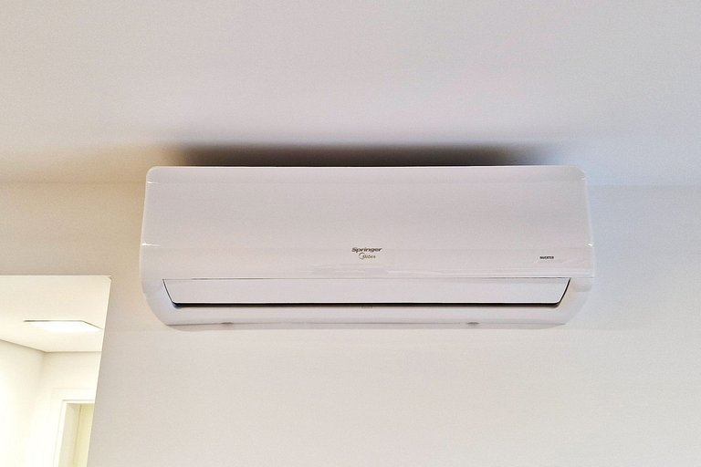 A sala de TV é bem arejada e integrada com a varanda e com cozinha super equipada. Na sala, TV Smart de 50", internet com excelente velocidade e ar condicionado. O quarto tem excelentes enxovais, armário, blackout e ar condicionado.