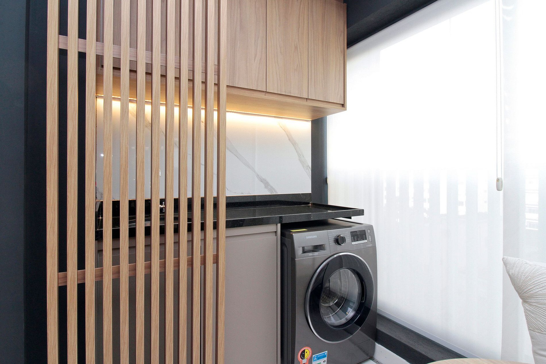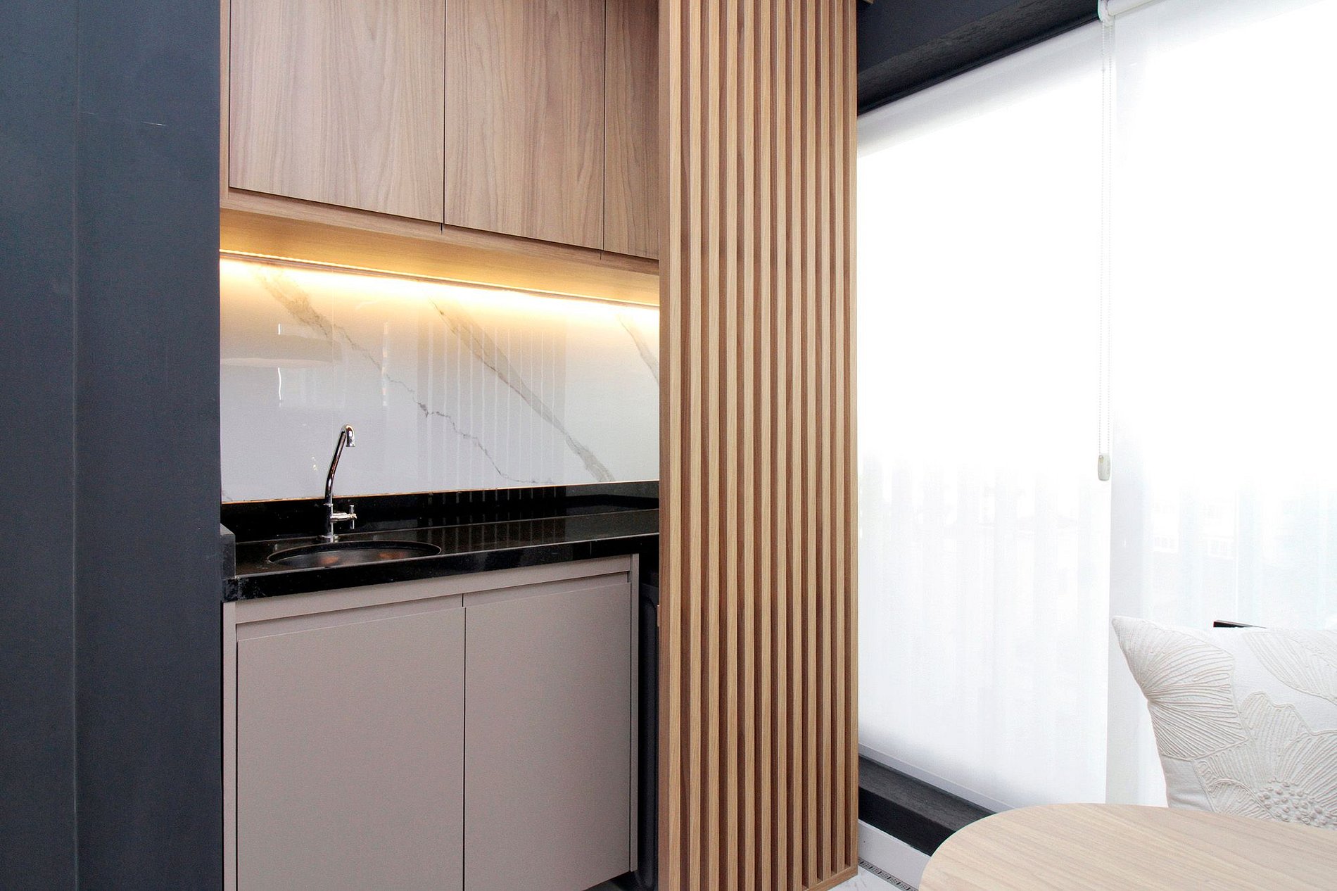 O quarto conta com blackout, TV Smart de 50", ar-condicionado, sofá retrátil, cama queen e ambiente acolhedor, integrado à varanda com mesa ampla, máquina lava e seca e uma vista incrível da cidade.