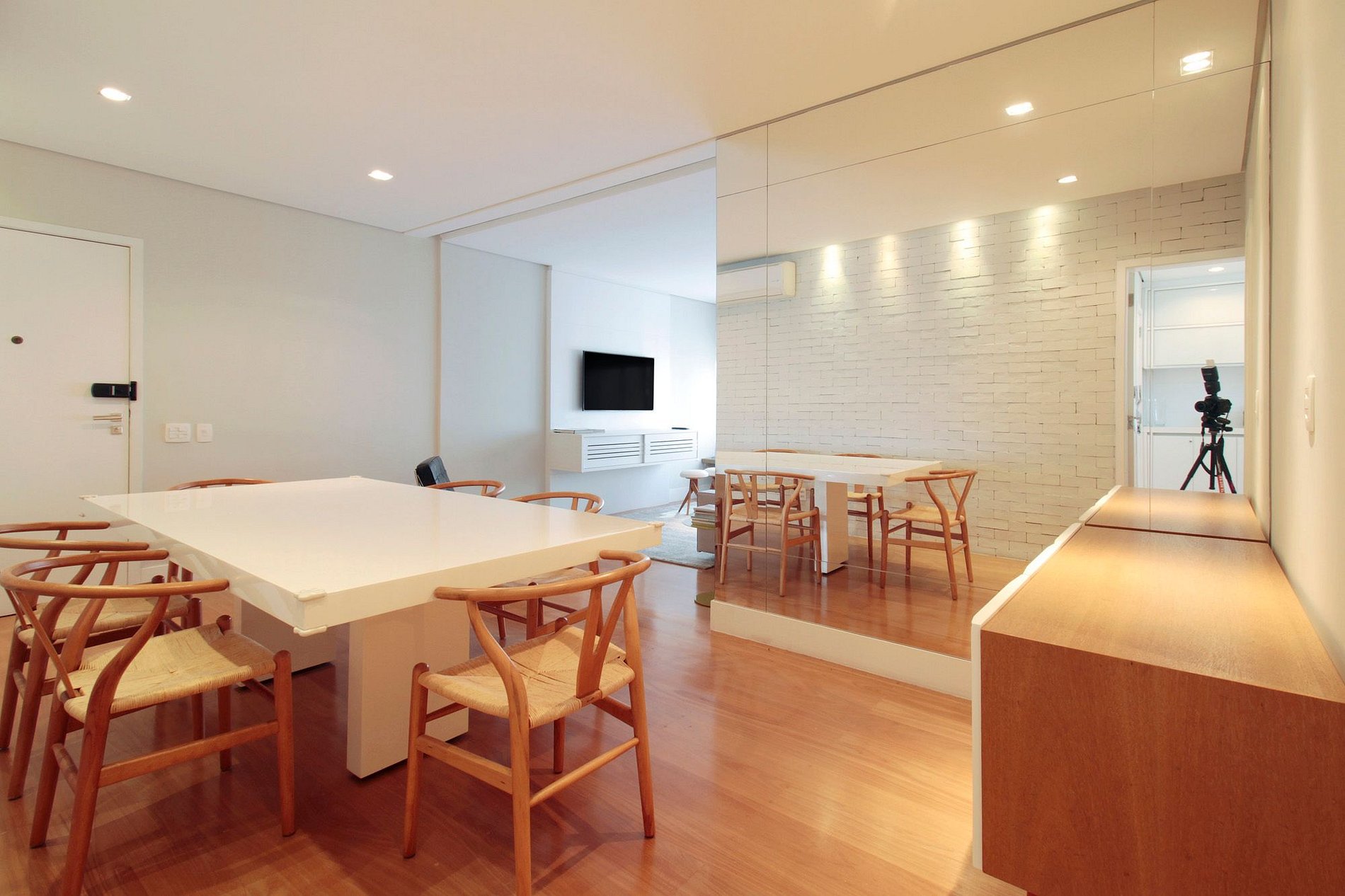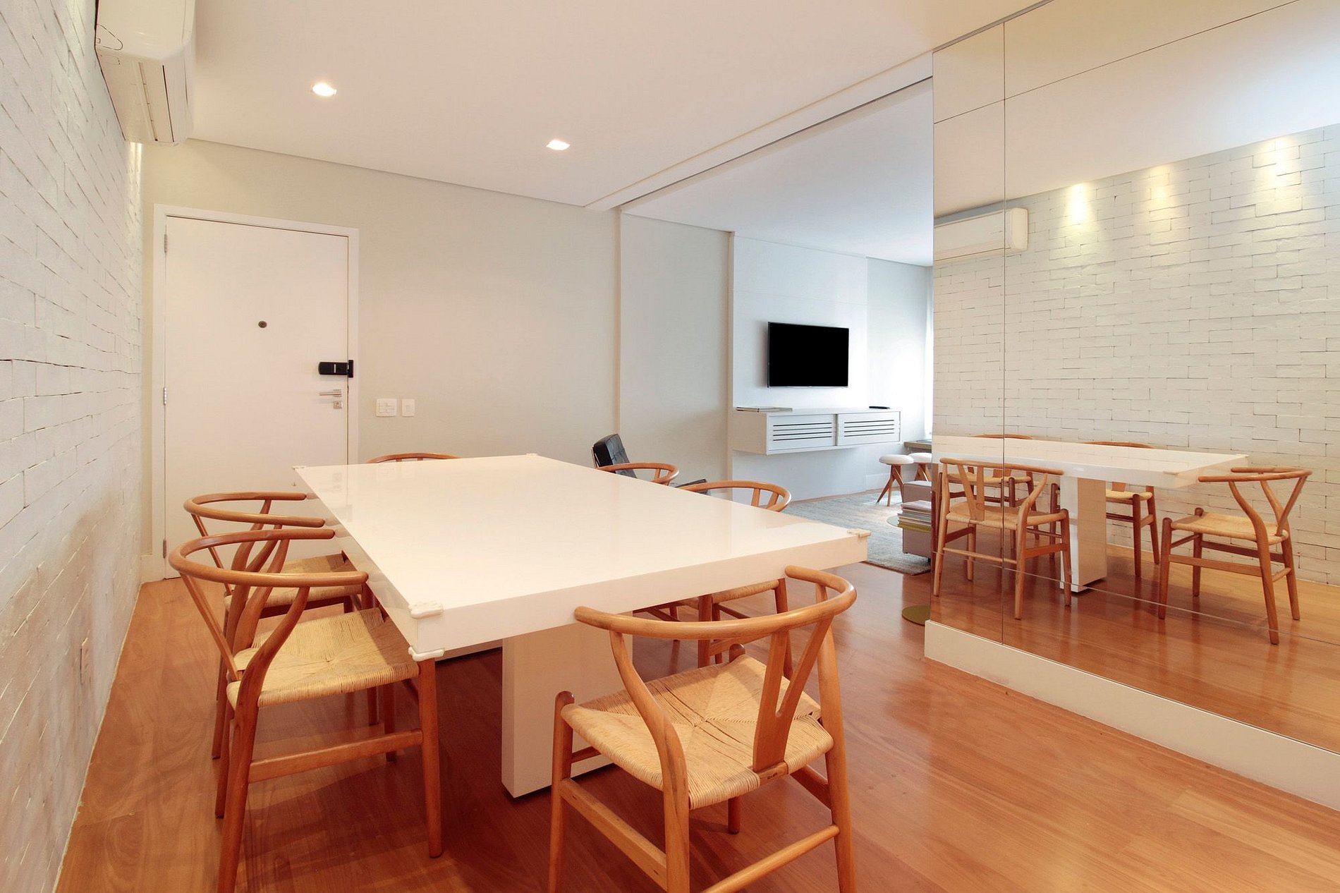 A sala é super arejada e iluminada, com TV Smart, excelente internet e uma vista linda para a copa das árvores dos Jardins. Sala de jantar com 8 lugares.