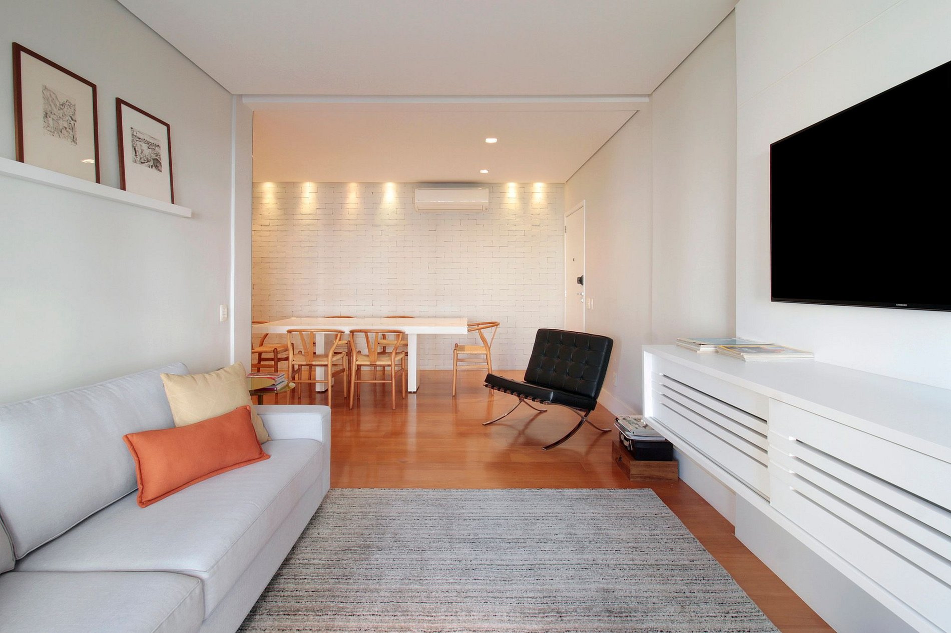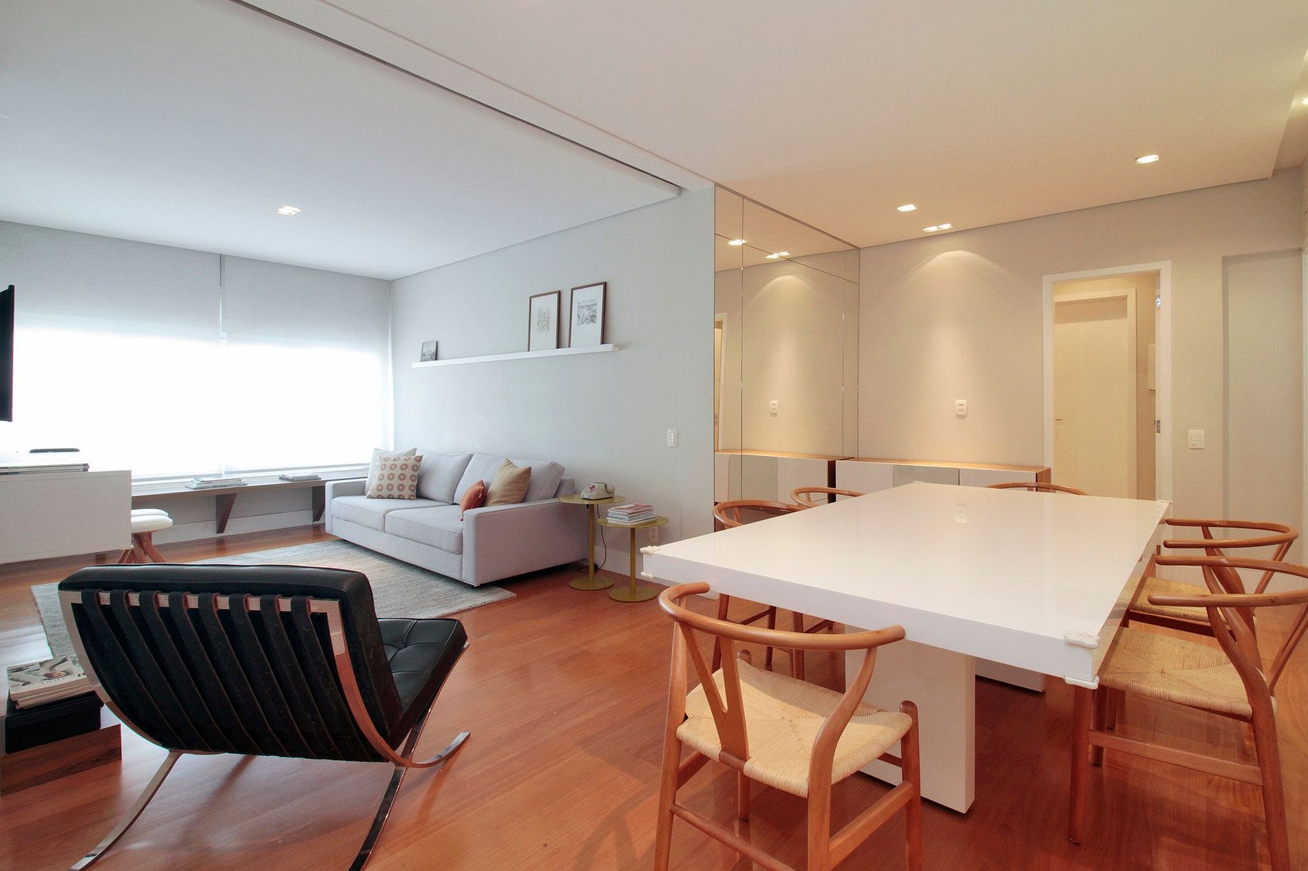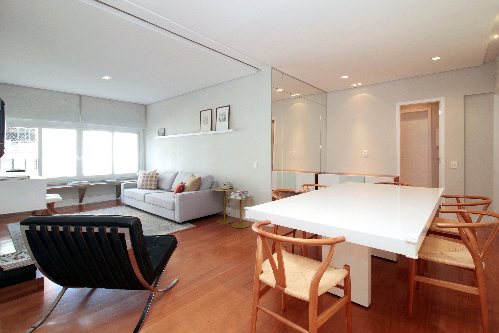 A sala é super arejada e iluminada, com TV Smart, excelente internet e uma vista linda para a copa das árvores dos Jardins. Sala de jantar com 8 lugares.