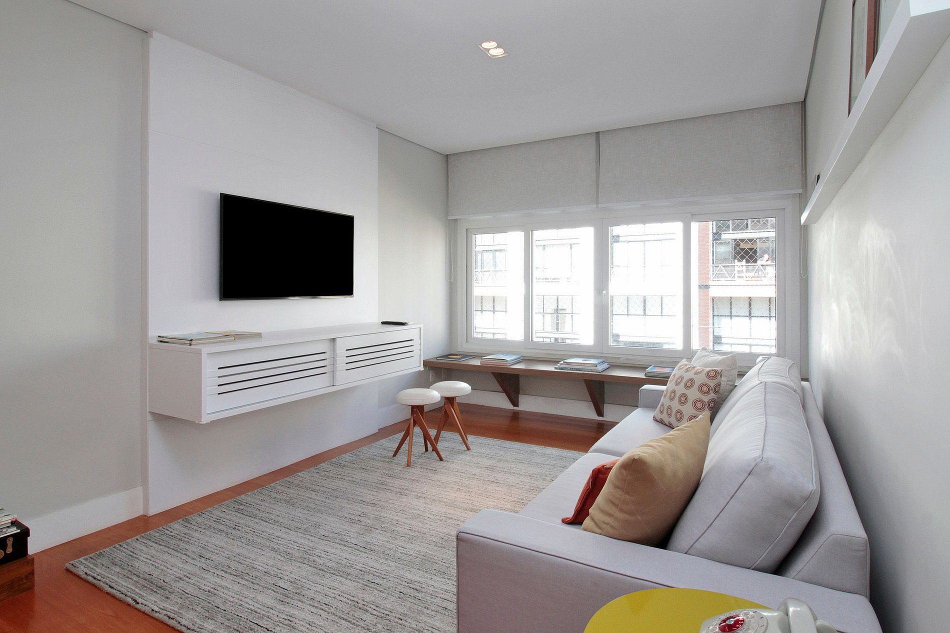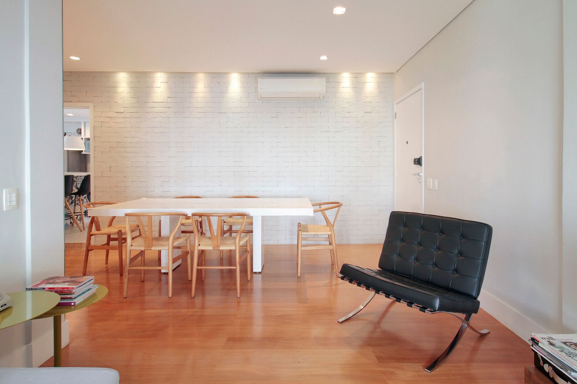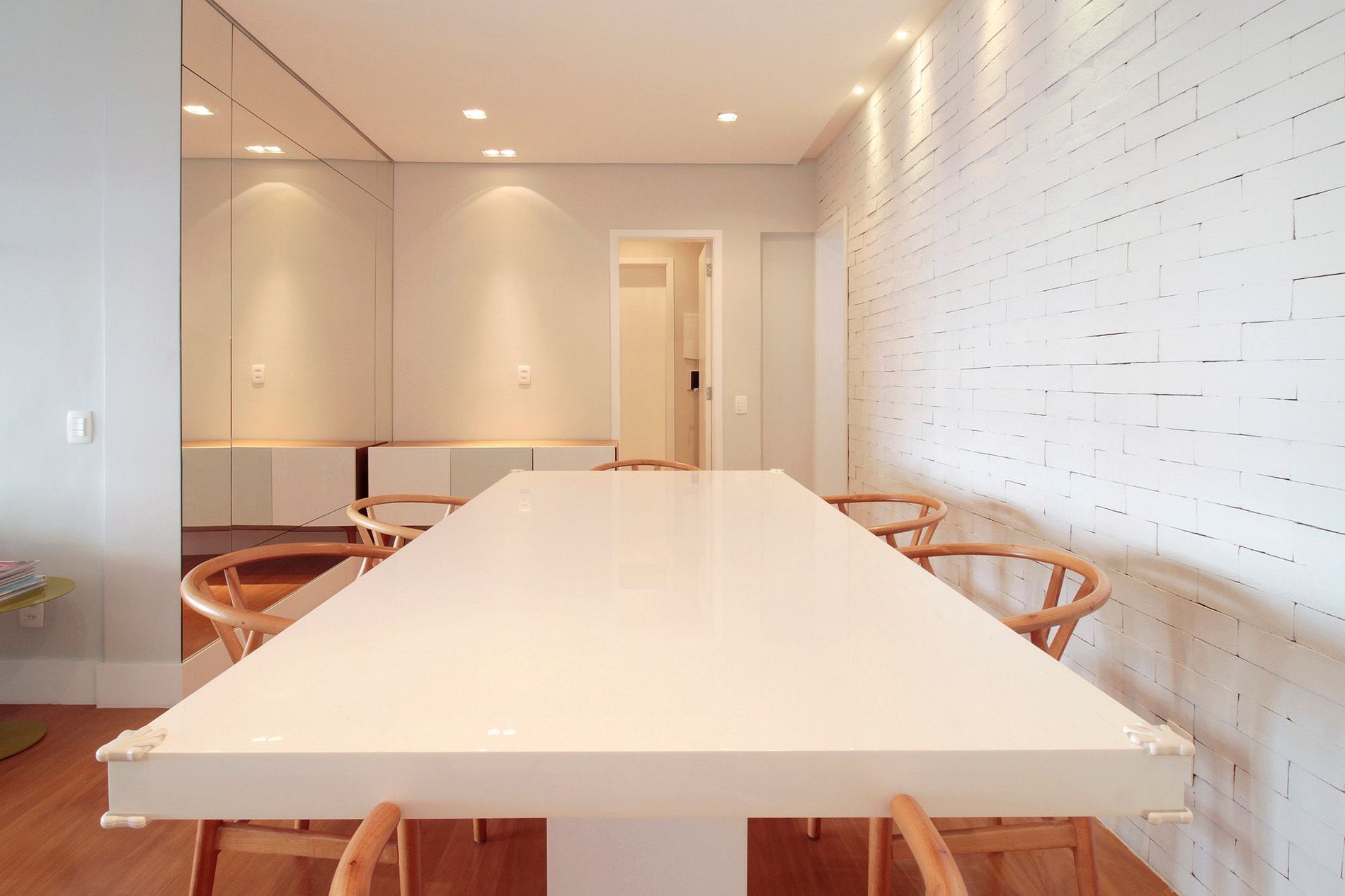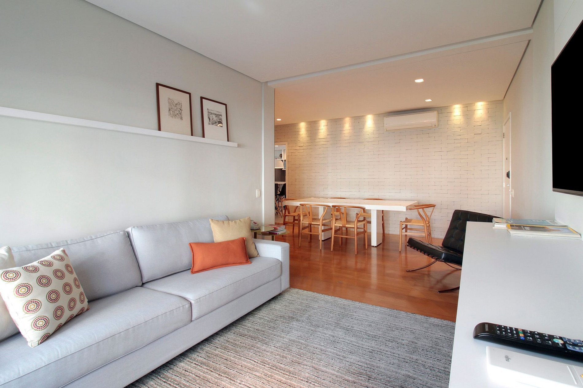 A sala é super arejada e iluminada, com TV Smart, excelente internet e uma vista linda para a copa das árvores dos Jardins. Sala de jantar com 8 lugares.