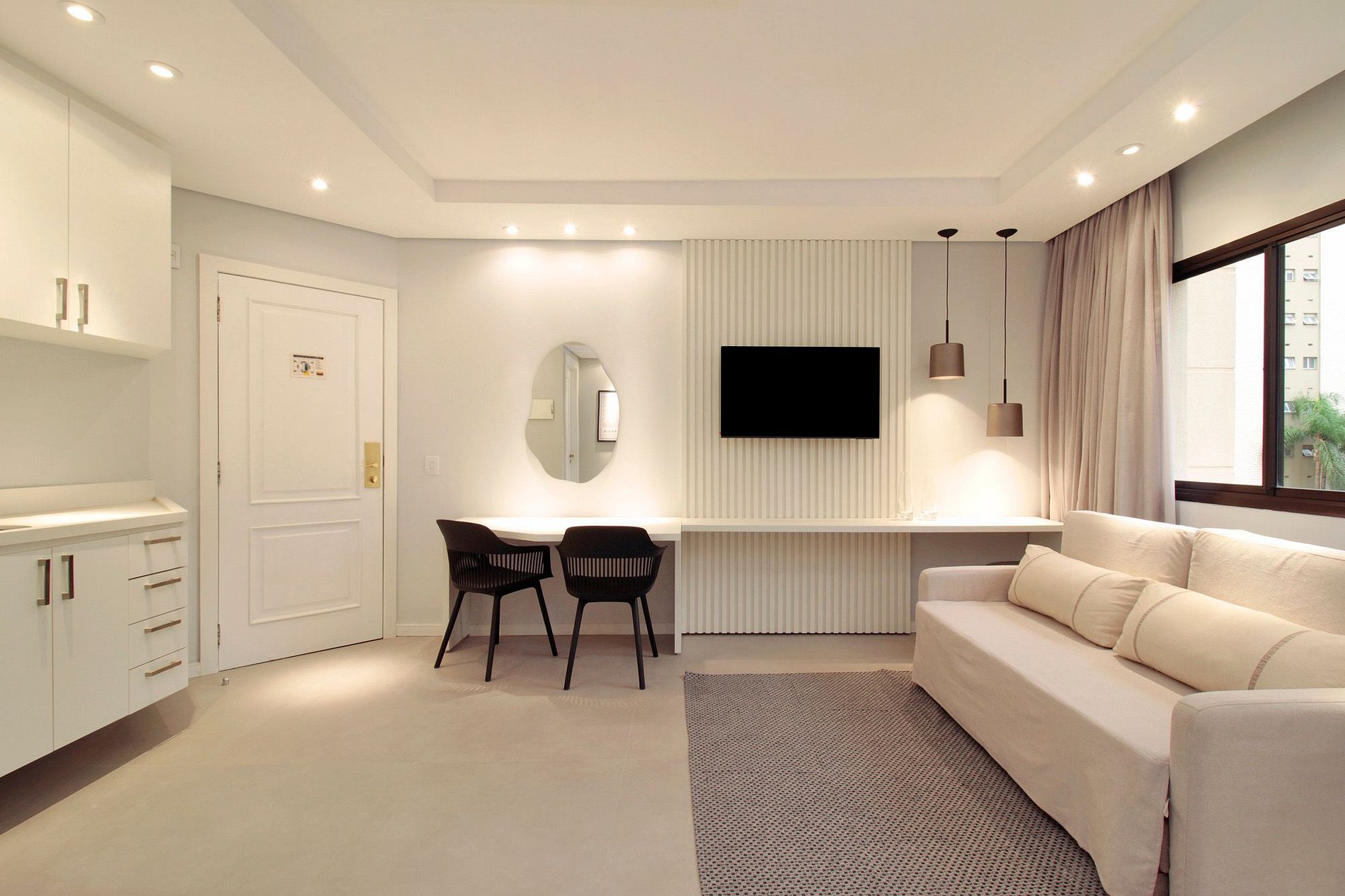 Dispõe de cama de casal, sofá-cama, enxoval de qualidade, cortina blackout, internet rápida, ar-condicionado, cozinha compacta e equipada, Smart TV e banheiro com excelente ducha.