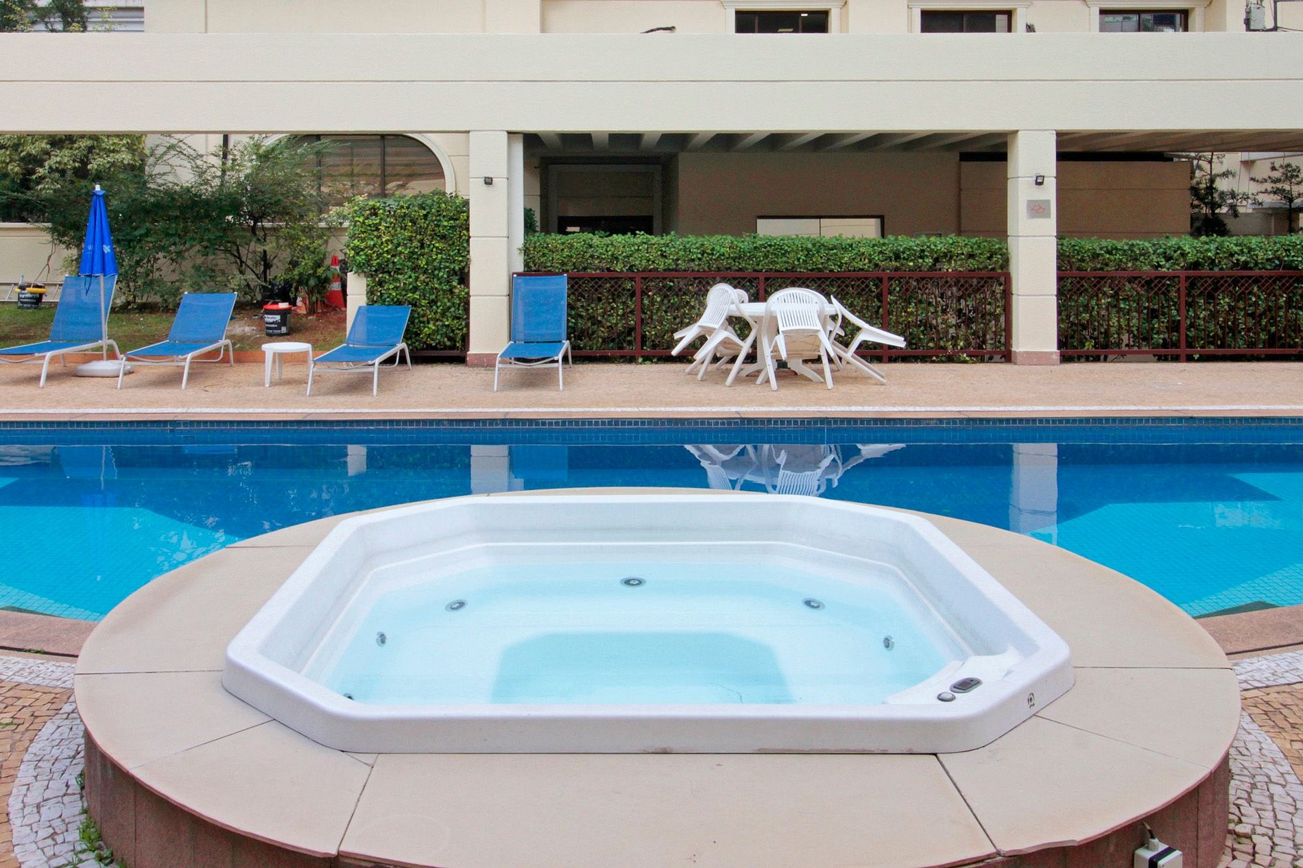 Áreas comuns: piscina externa, academia, lavanderia e sauna disponíveis para hóspedes.