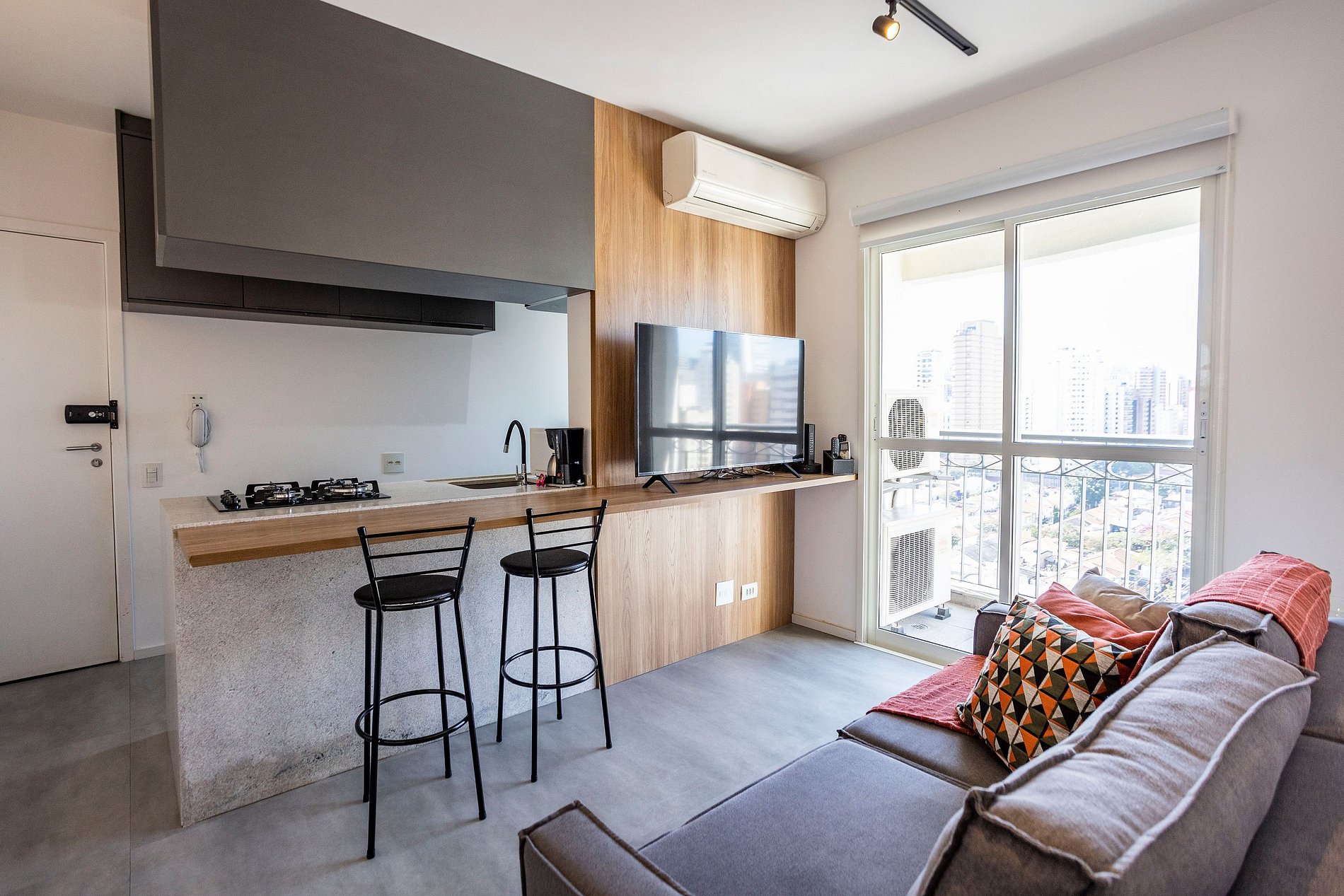 Apartamento aconchegante na tranquila rua Miguel Calfat. Possui cozinha equipada integrada à sala, TV de 50", banheiro com ducha incrível e quarto com ar-condicionado e TV. Para relaxar, aproveite a varanda com uma linda vista da cidade!