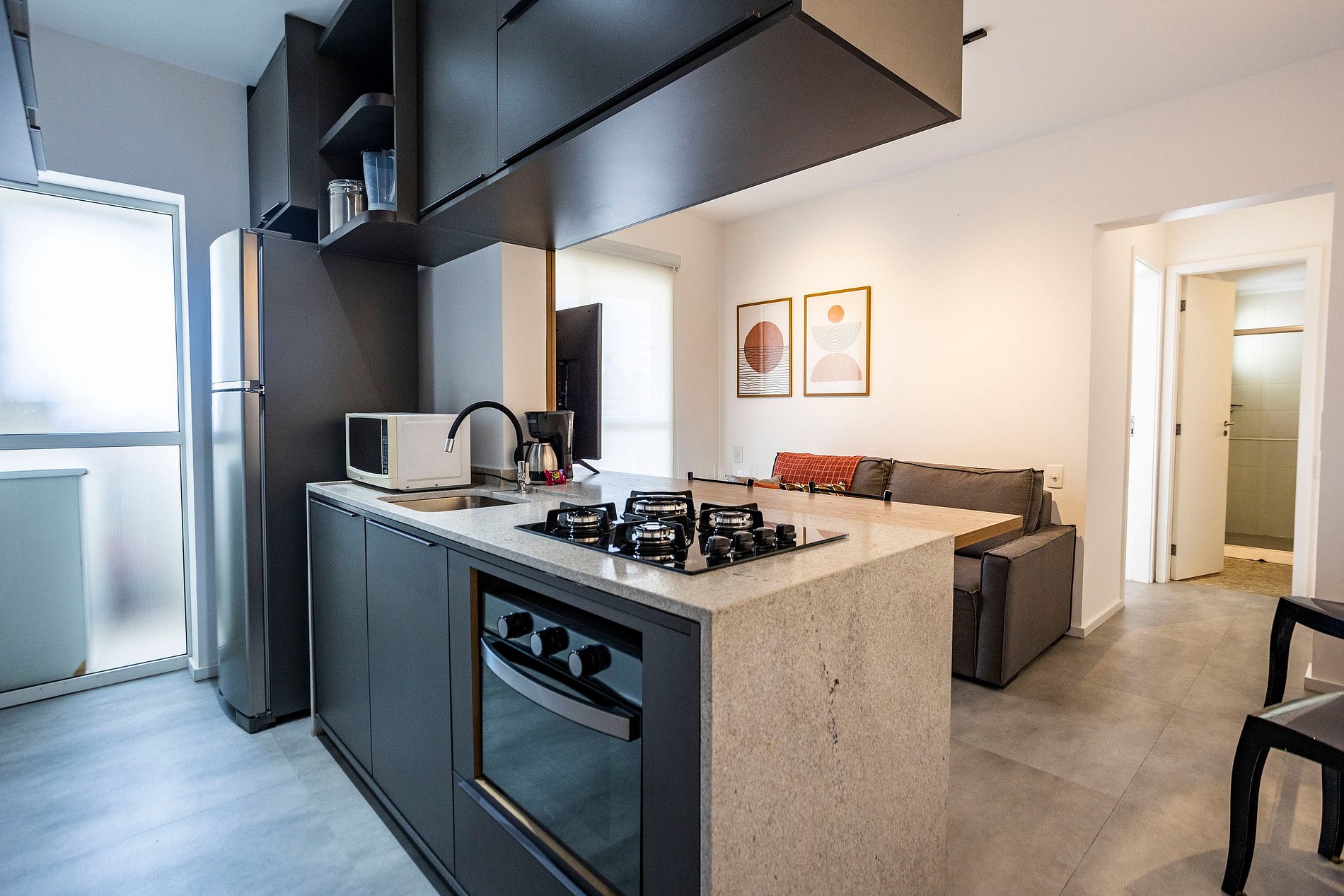 Apartamento aconchegante na tranquila rua Miguel Calfat. Possui cozinha equipada integrada à sala, TV de 50", banheiro com ducha incrível e quarto com ar-condicionado e TV. Para relaxar, aproveite a varanda com uma linda vista da cidade!