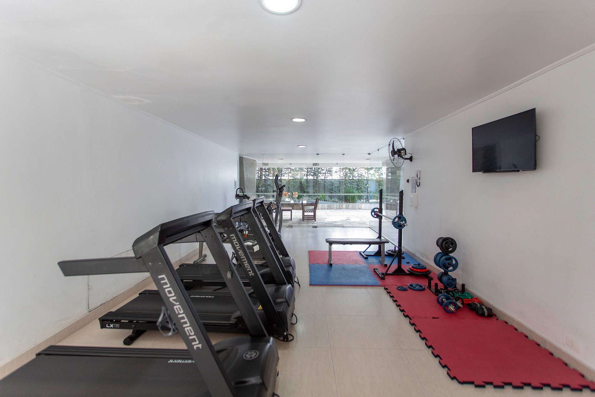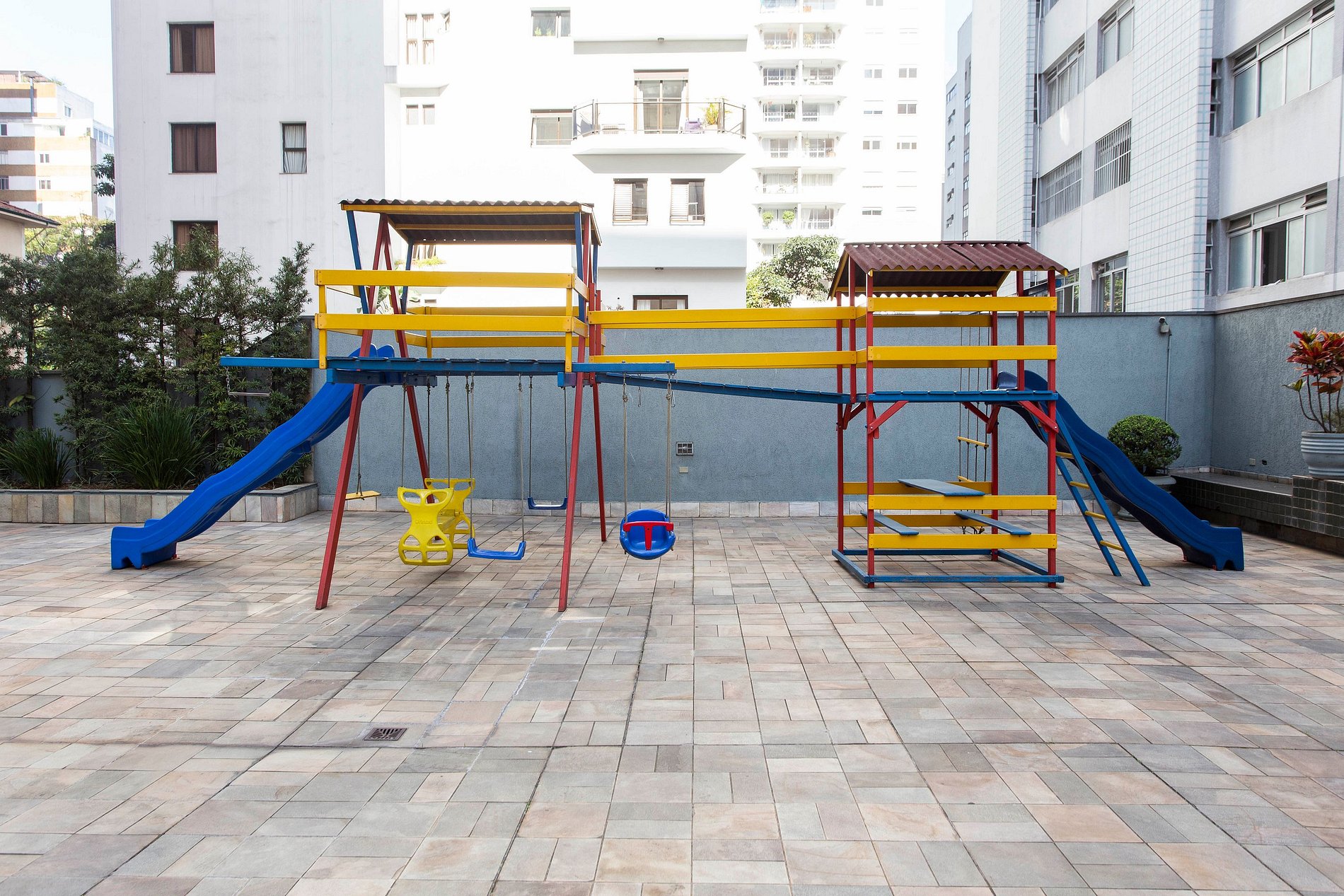 O prédio oferece um espaço de descanso, com jardim, playground e academia.