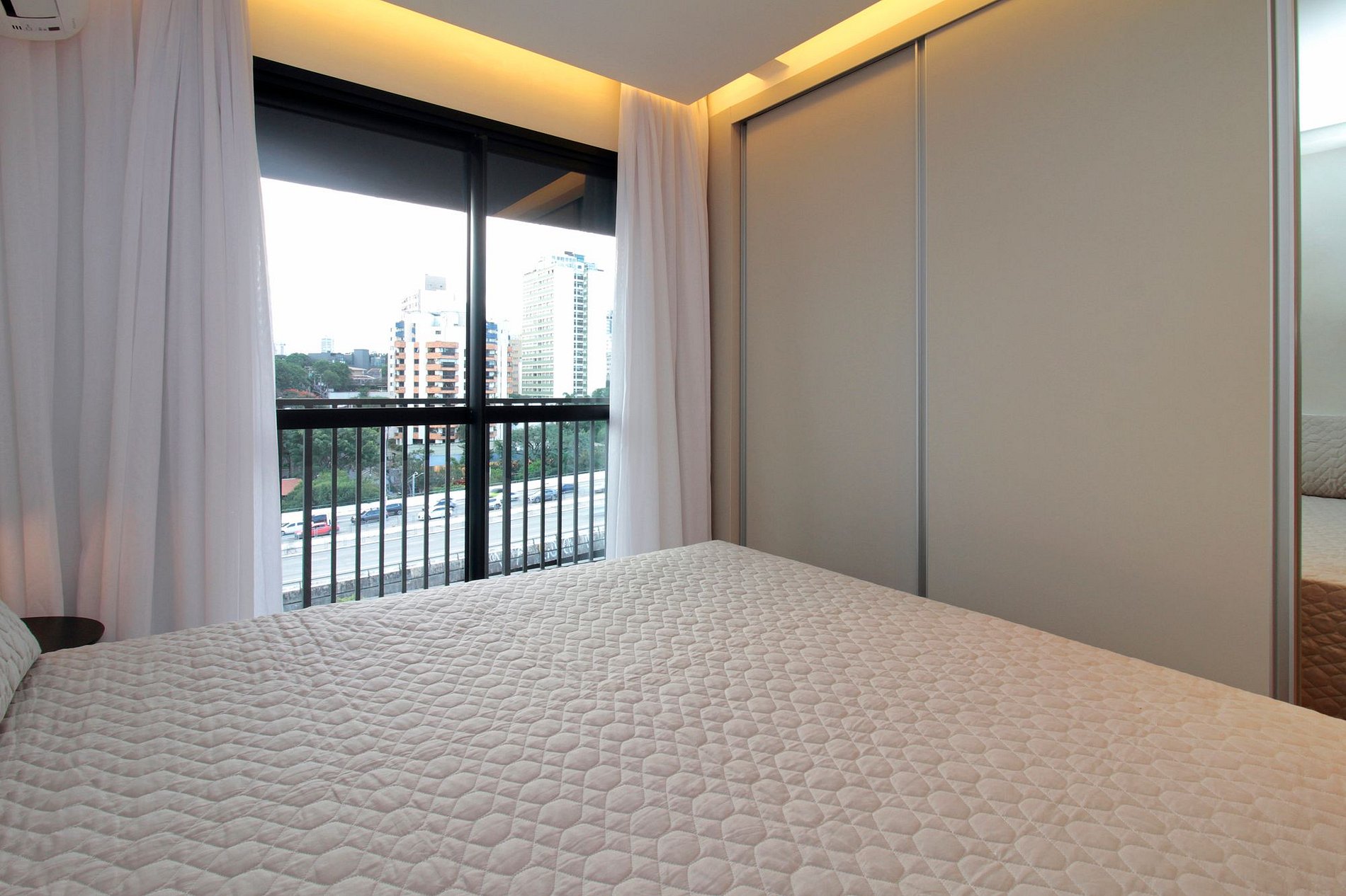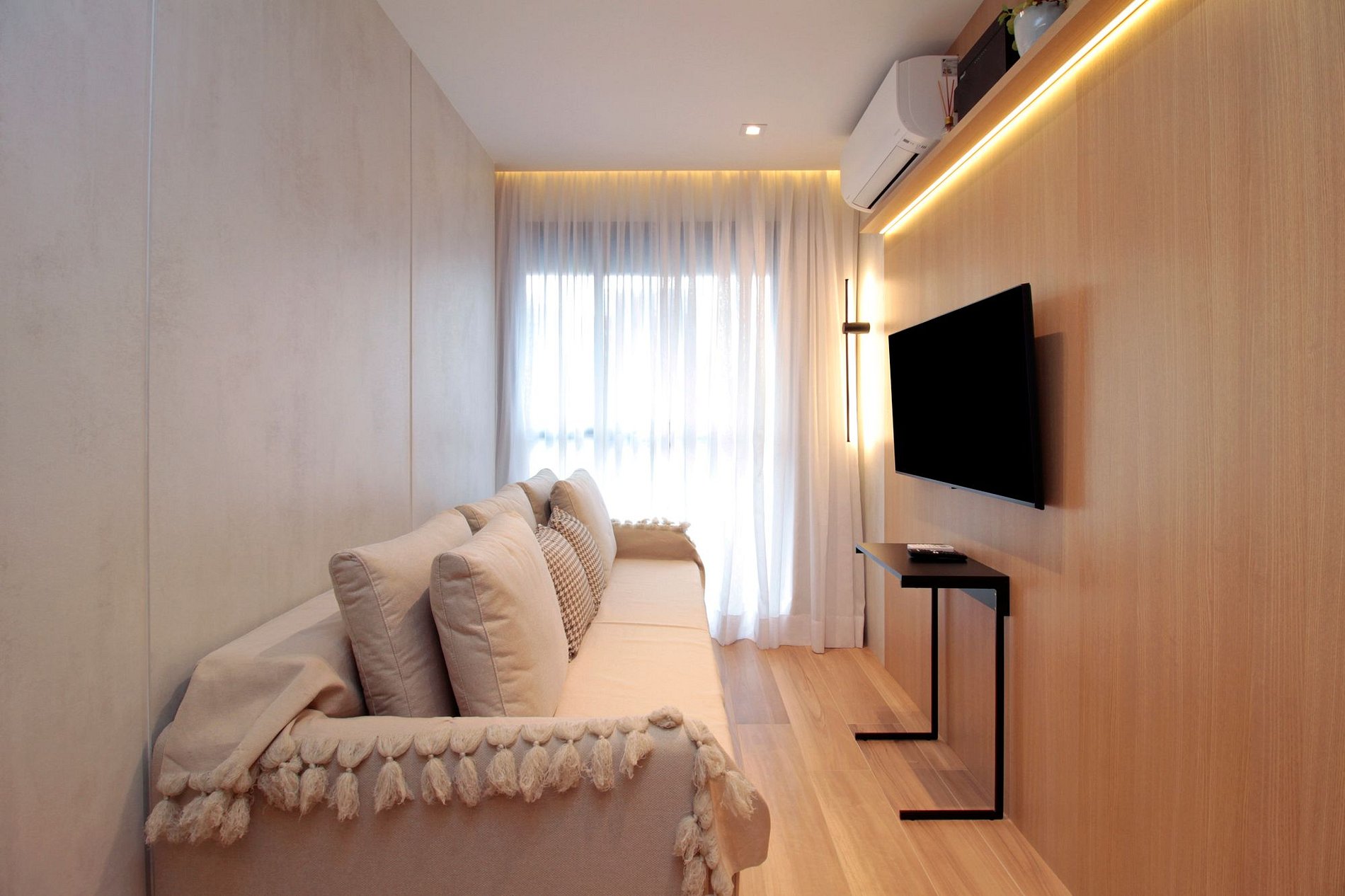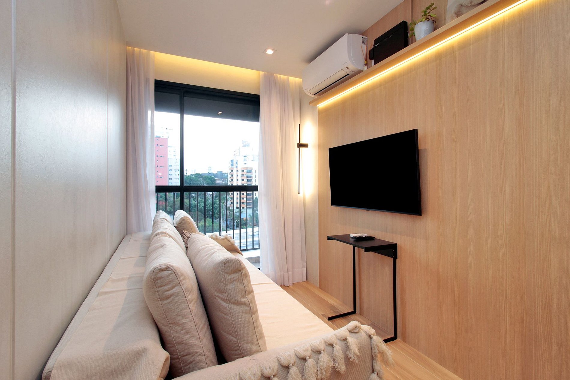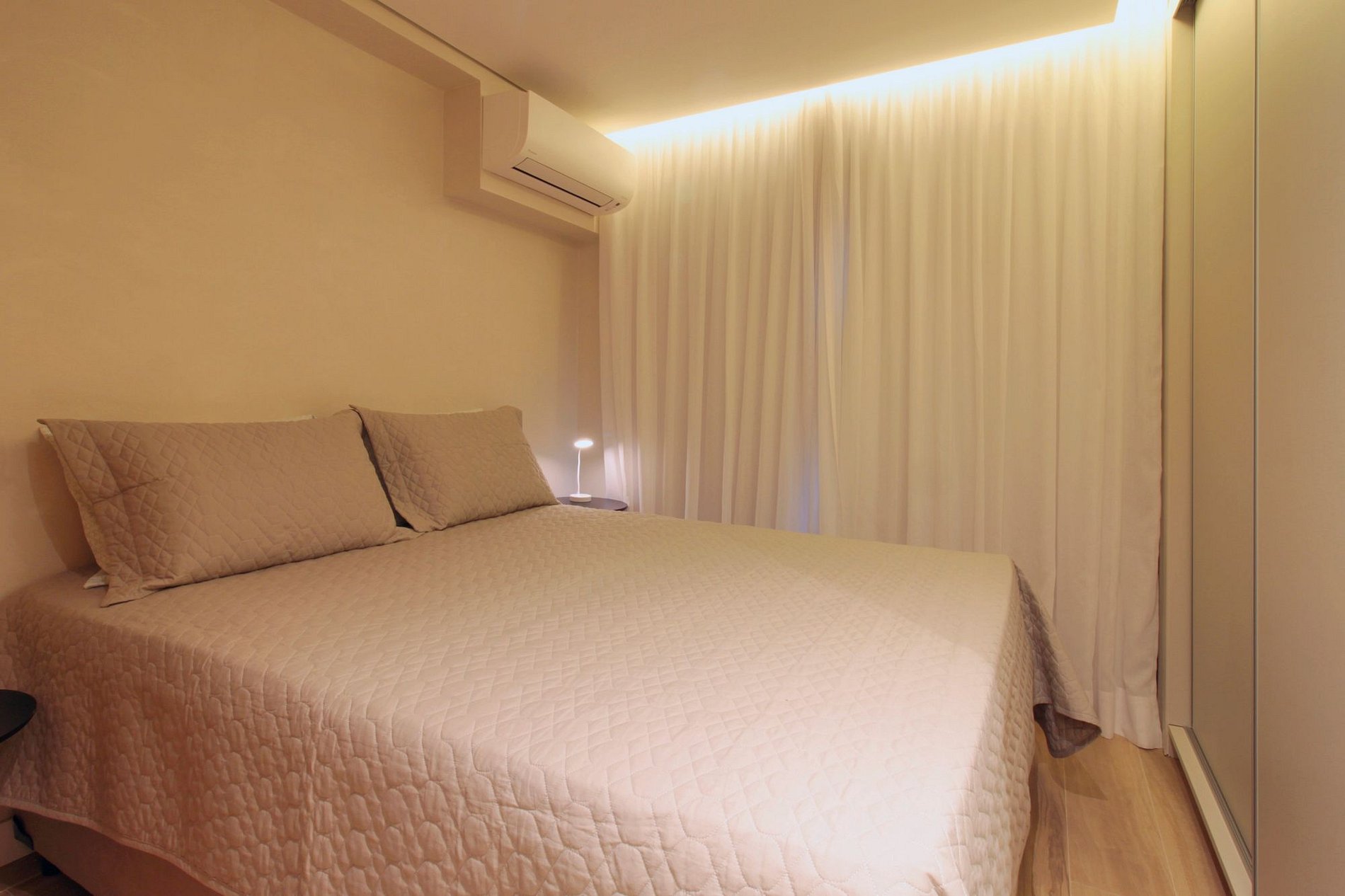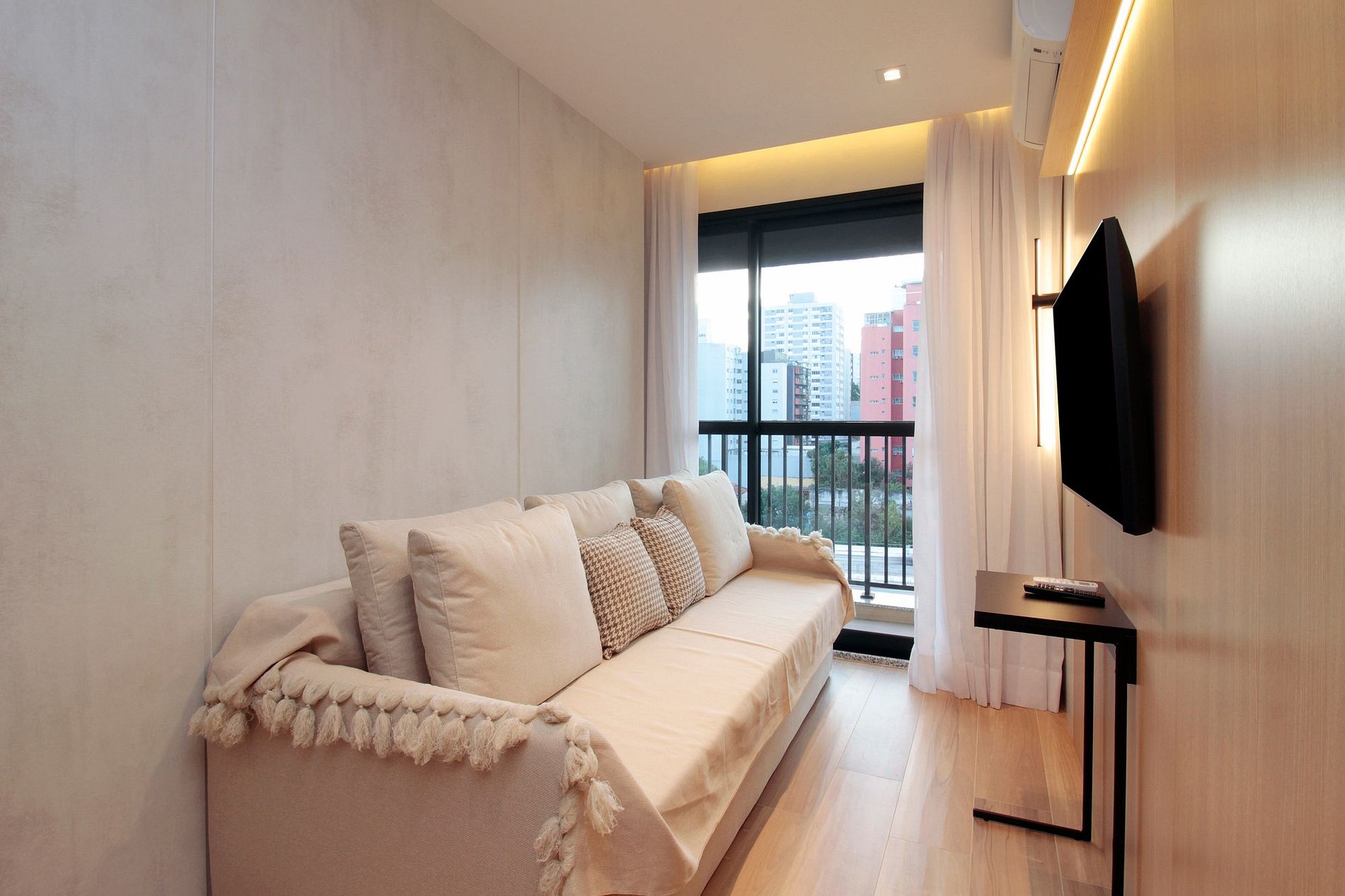 Os 35m2 são bem distribuídos entre a sala integrada com varandinha e cozinha bem completa. Nela, temos sofa confortável, cortina blackout, ar condicionado, TV Smart e excelente internet.